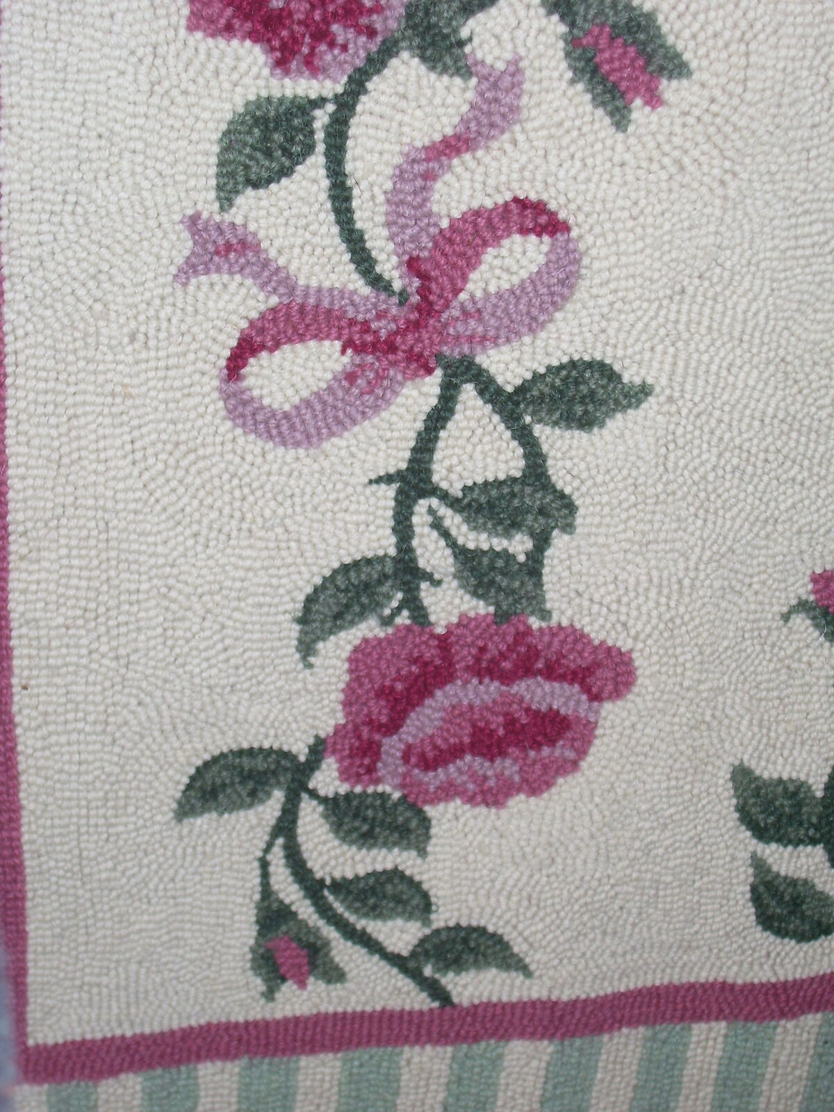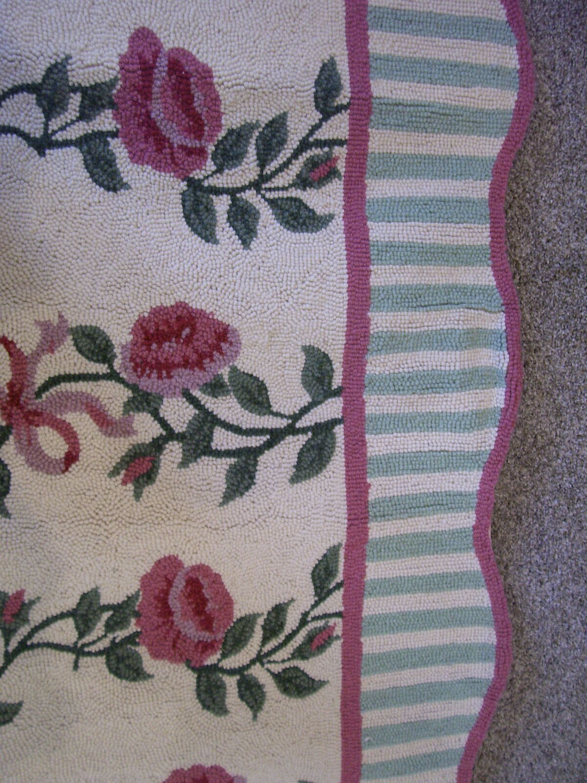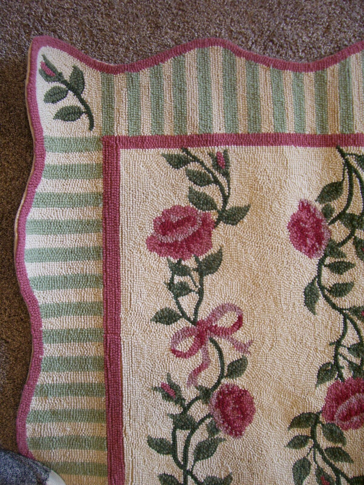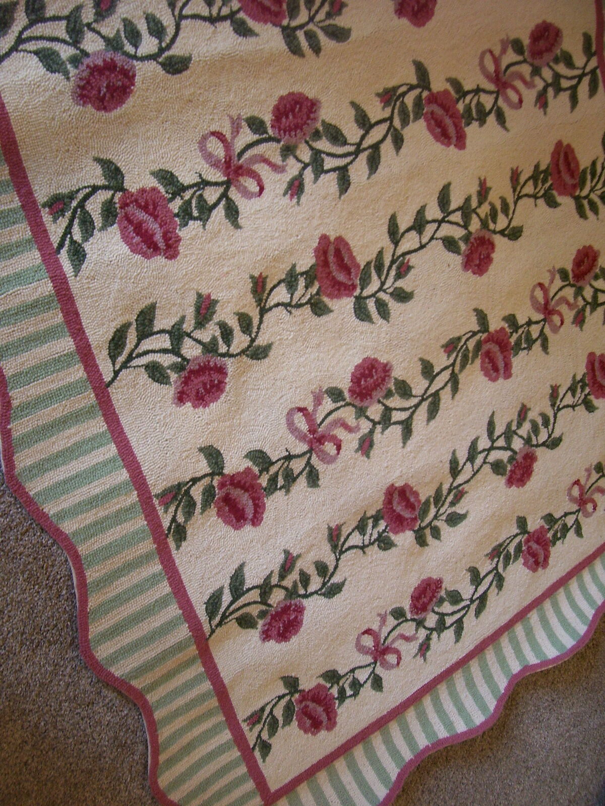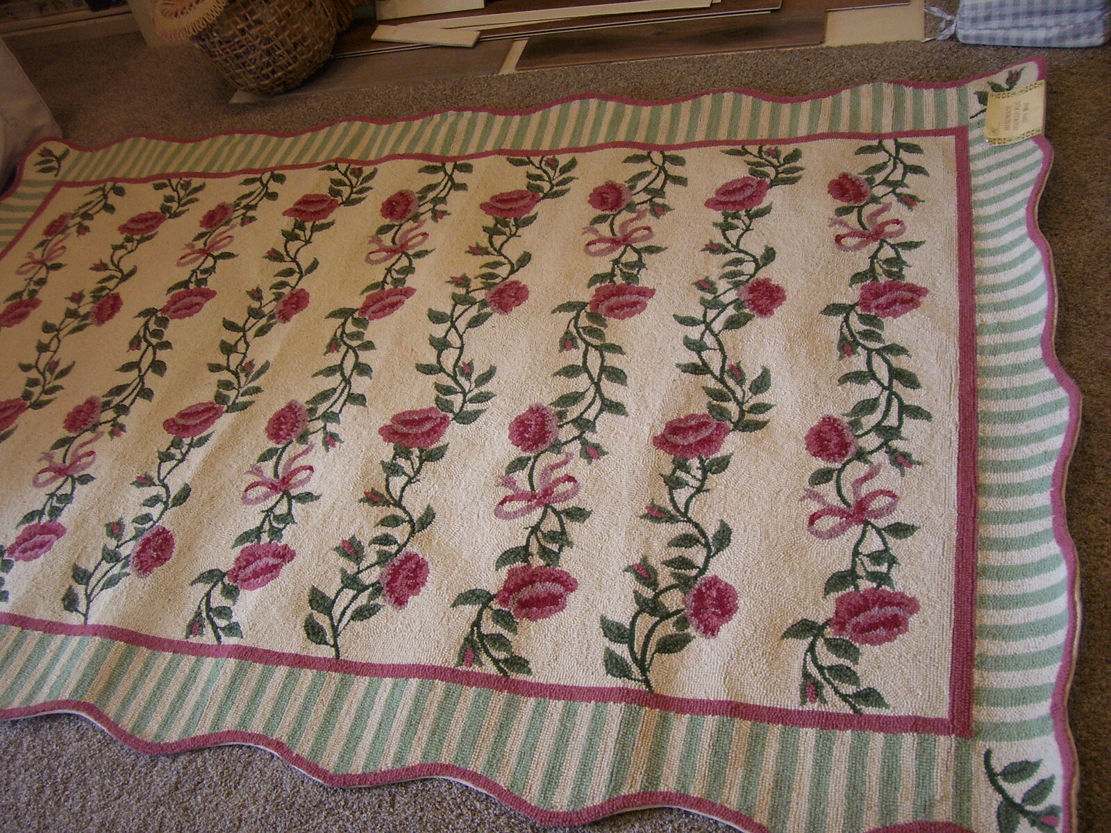 Perfect for a little or big girl's room, Mom's room, Living, Bedroom, under Kitchen table, or anywhere. I love the Scalloped edge with green stripes. Perfect finishing touch for the pink flowers and ribbon bows. The background is cream, ivory, off white neutral color. It can go with many styles: Shabby Chic, Feminine, Victorian, Girlie, Princess, Diva, or a fun touch to brighten up a simple room.