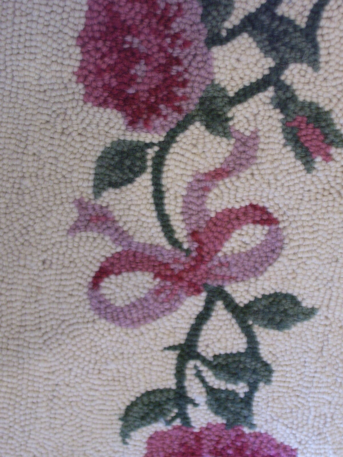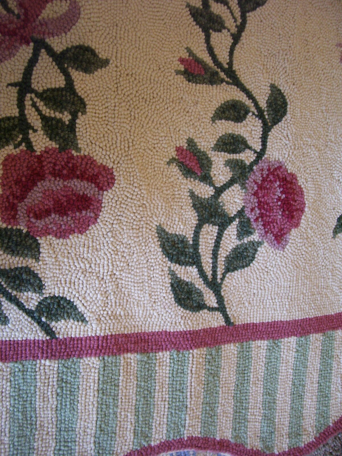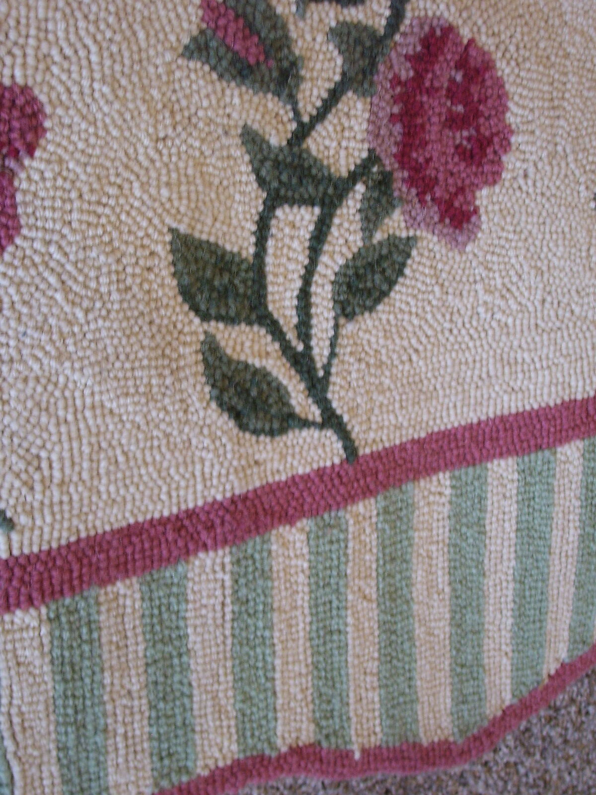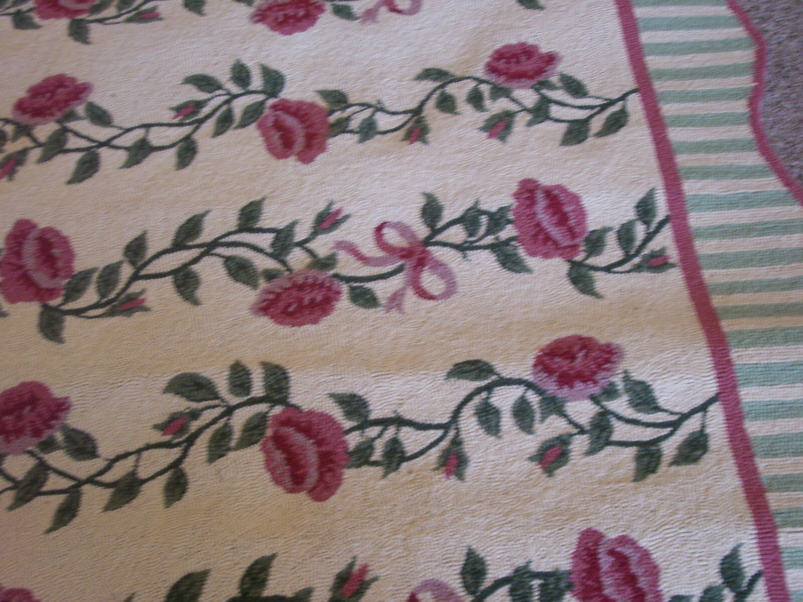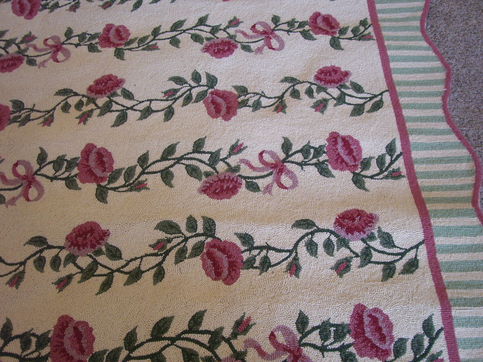 Perfect for a little or big girl's room, Mom's room, Living, Bedroom, under Kitchen table, or anywhere. I love the Scalloped edge with green stripes. Perfect finishing touch for the pink flowers and ribbon bows. The background is cream, ivory, off white neutral color. It can go with many styles: Shabby Chic, Feminine, Victorian, Girlie, Princess, Diva, or a fun touch to brighten up a simple room.