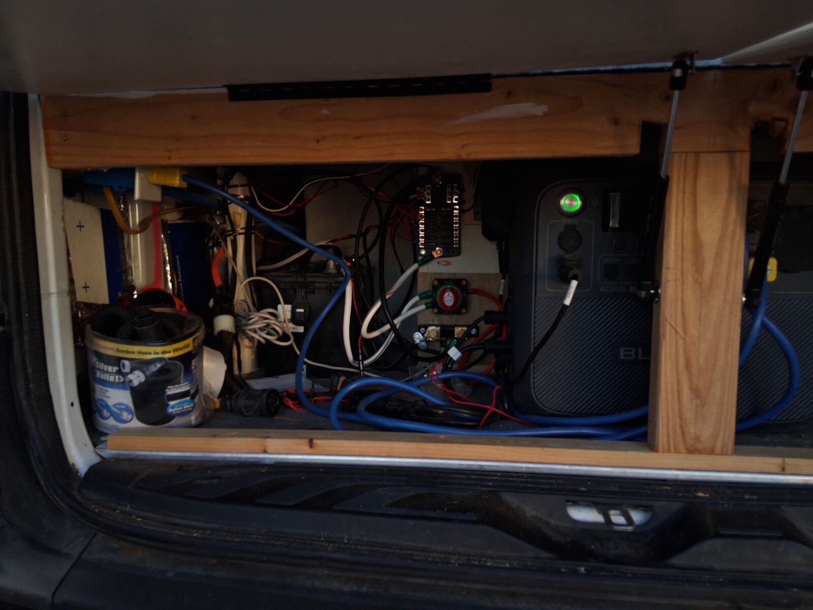 Let’s get to the nuts and bolts of it. 4 solar panels provide enough power that you never have to plug in for power, but if you want to you can do that too. Bluetti 200l power system is the brains of the operation and works amazing to give you both AC and DC power on demand. Want to run a blow dryer, Do it, I dare you!