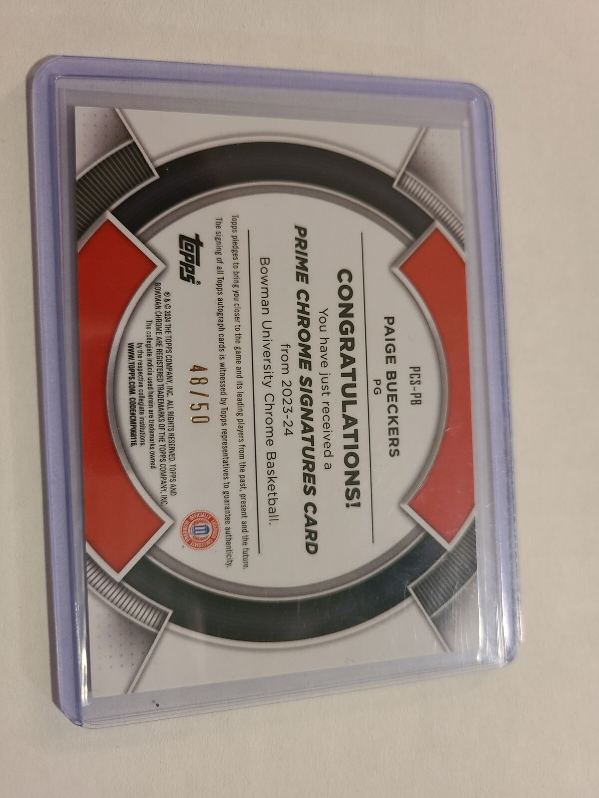 VenmoLimited-edition Prime Chrome Signatures card of Paige Bueckers, numbered 48/50, featuring a bold on-card autograph. This is a certified Topps Chrome auto from the 2023-24 Bowman University series — one of the most sought-after NIL-era cards of a generational talent.