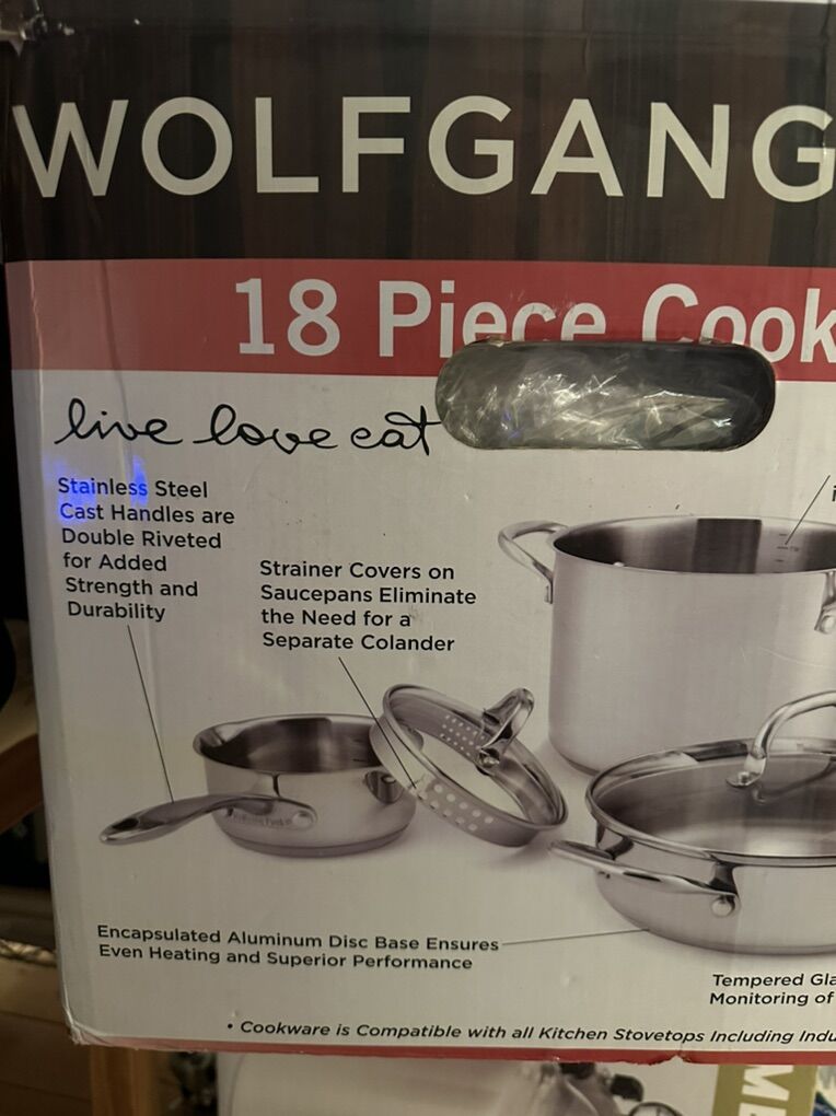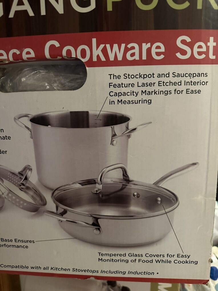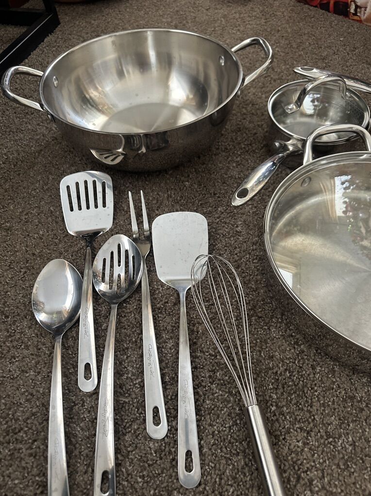 Stainless steel pan set. Cast handles that are double riveted for strength. Encapsulated Aluminum disc base ensures even heating and superior performance with this cookware. Tempored glass lids. The stockpot and Suacepans feature lase etched interior markings for easy measuring of liquids. Inlcuded is the 12 inch chef pot and lid set. Only one pan has been used one time to boil water so basically brand new. Asking 150 obo. Paid over 250. The chef pan alone would be 75 dollars so this 18 piece set is a super good value. Used a couple pans once and my mom then changed her mind.