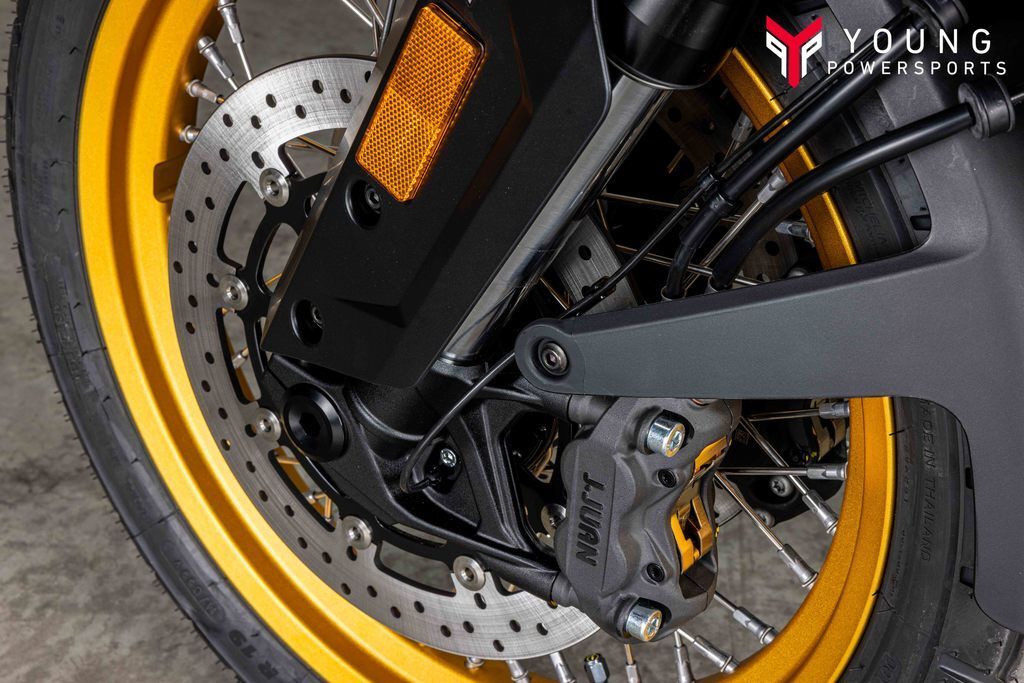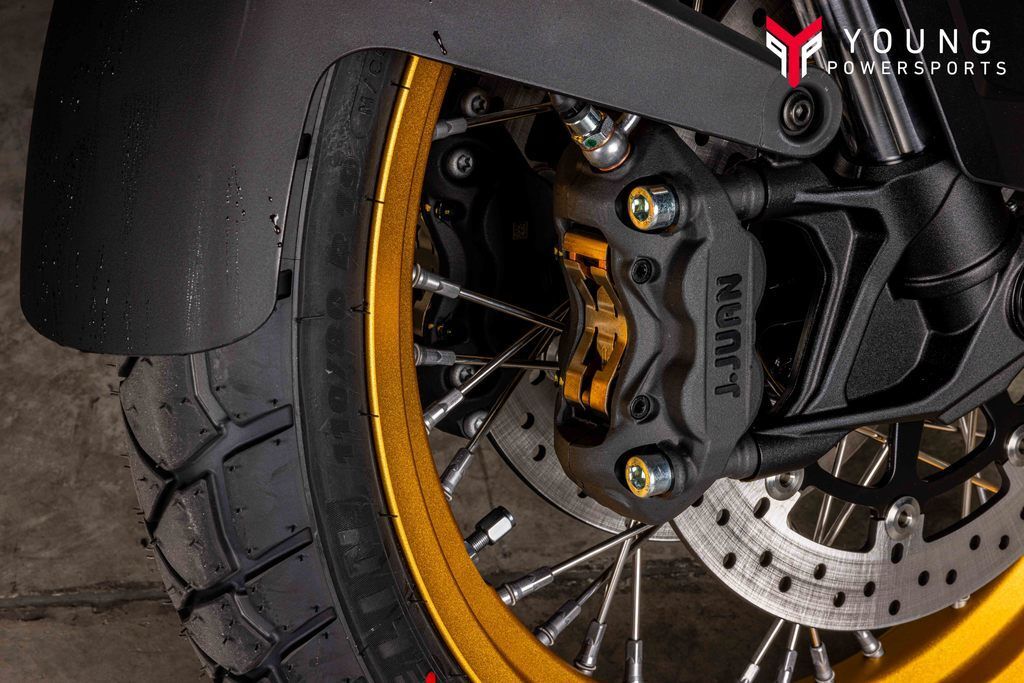 Braking Power Delivered- J.Juan calipers and large 320mm dual front discs deliver strong, predictable braking with progressive feel—ideal for a loaded bike descending mountain passes or shedding speed into a corner. Rear brake setup balances control with confidence on varied terrain.