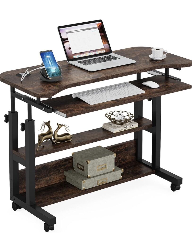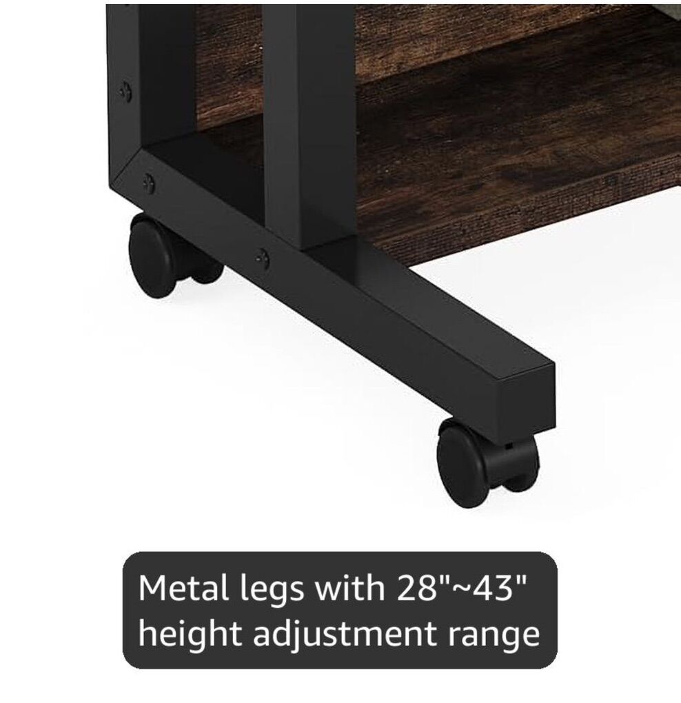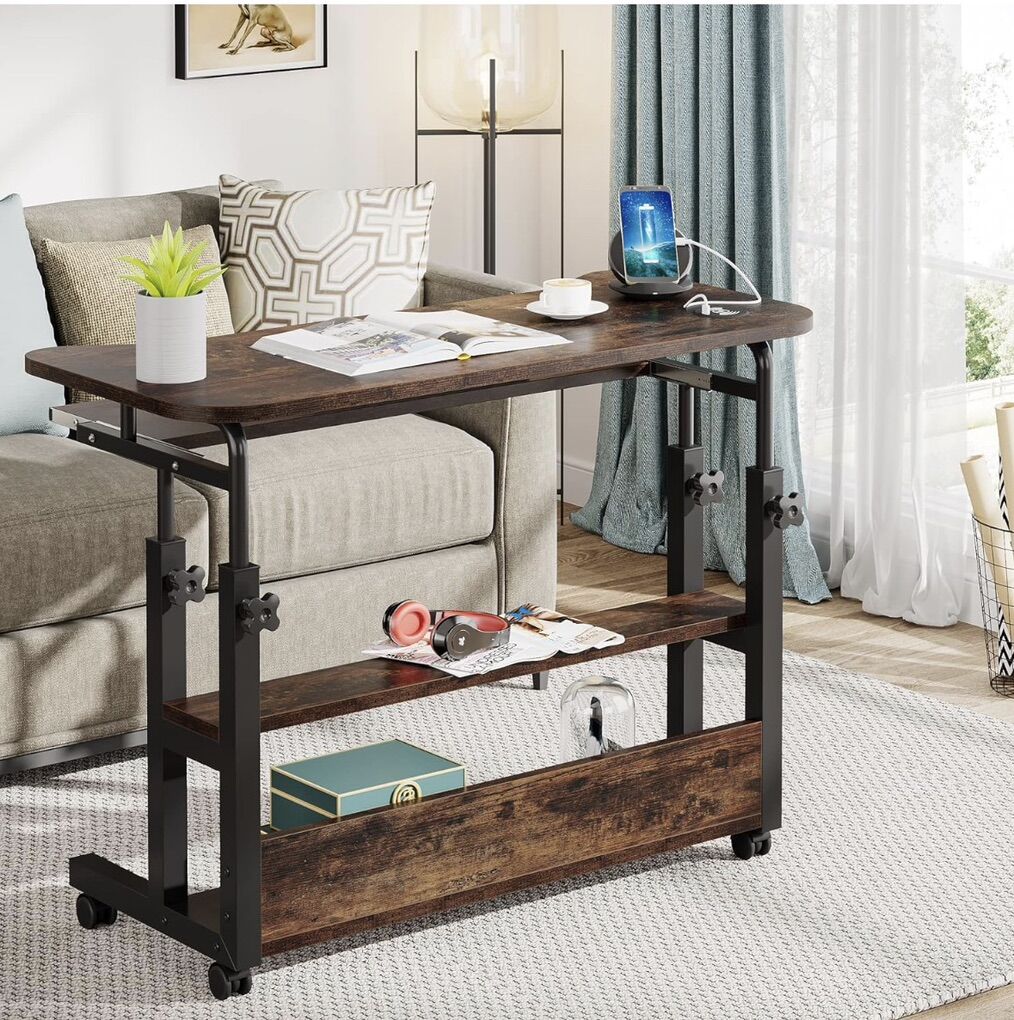 Portable Desk with Power Outlets, Height Adjustable Side Table Sofa Couch Bedside Laptop Computer Cart with USB Charging Ports, Mobile Small Standing Desk with Keyboard Tray.