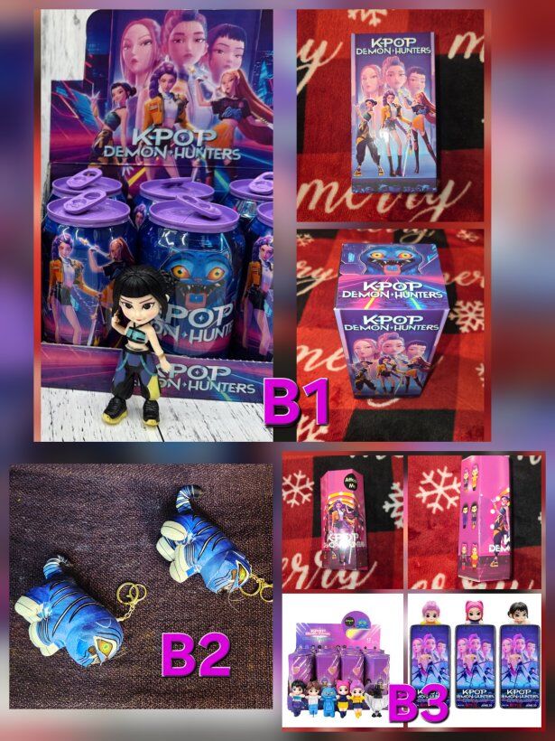 [A1] 3 -Piece Kpop Demon Hunters Singing Dolls $55. [A2] 3-Piece (slightly bigger) Kpop Demon Hunters Singing Dolls $55. [A3] XL 21" Kpop Demon Hunters Singing Rumi Doll $60. 55 [B1] Surprise Kpop Demon Hunters Soda Can and Figurine $14. [B2] Kpop Demon Hunters Blue Derpy Tiger Keychain $10. [B3] Surprise Kpop Demon Hunters Phone/Tablet/Computer Attach Me Figurine $12.