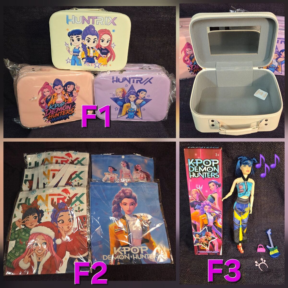 [F1] Large Kpop Demon Hunters Makeup/Carry Case with mirror (10"x7") $45. [F2] Kpop Demon Hunters Canvas Tote Bags (12.5"x14") $22. [F3] Kpop Demon Hunters Singing Zoey Doll with accessories $28.
