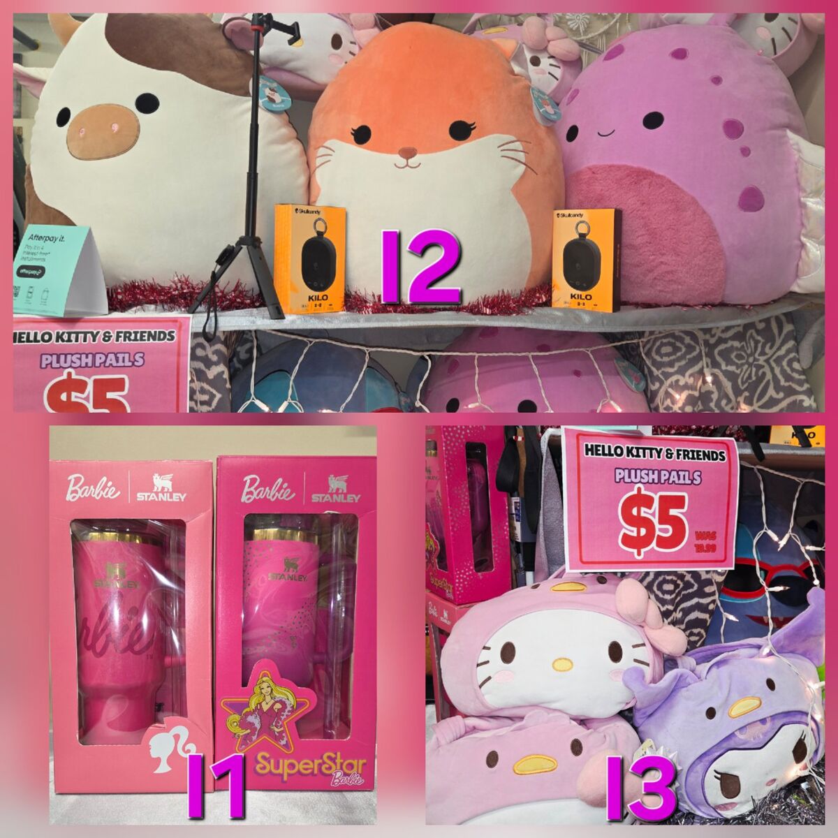 [I] 40 oz Barbie Stanley H2.0 Tumblers $60 each. SOLD [I2] Large Squishmallows 16"-24", $15-$25. [I3] Hello Kitty Pillow Pail/Basket $5.
