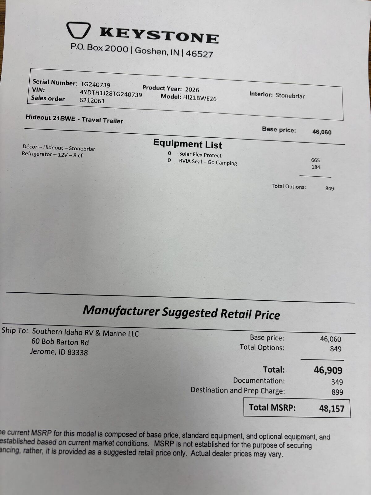 SHOP YOUR LOCAL DEALER, CHECK THE INTERNET, Our price is the best! Southern Idaho RV & Marine is offering for a LIMITED TIME ALL our Brand-New Keystone Hideouts in stock, at our cost! CALL ABOUT ADDITIONAL FLOORPLAN IN STOCK! We are a local family-owned dealer, with low overhead and non-commissioned salespeople.
