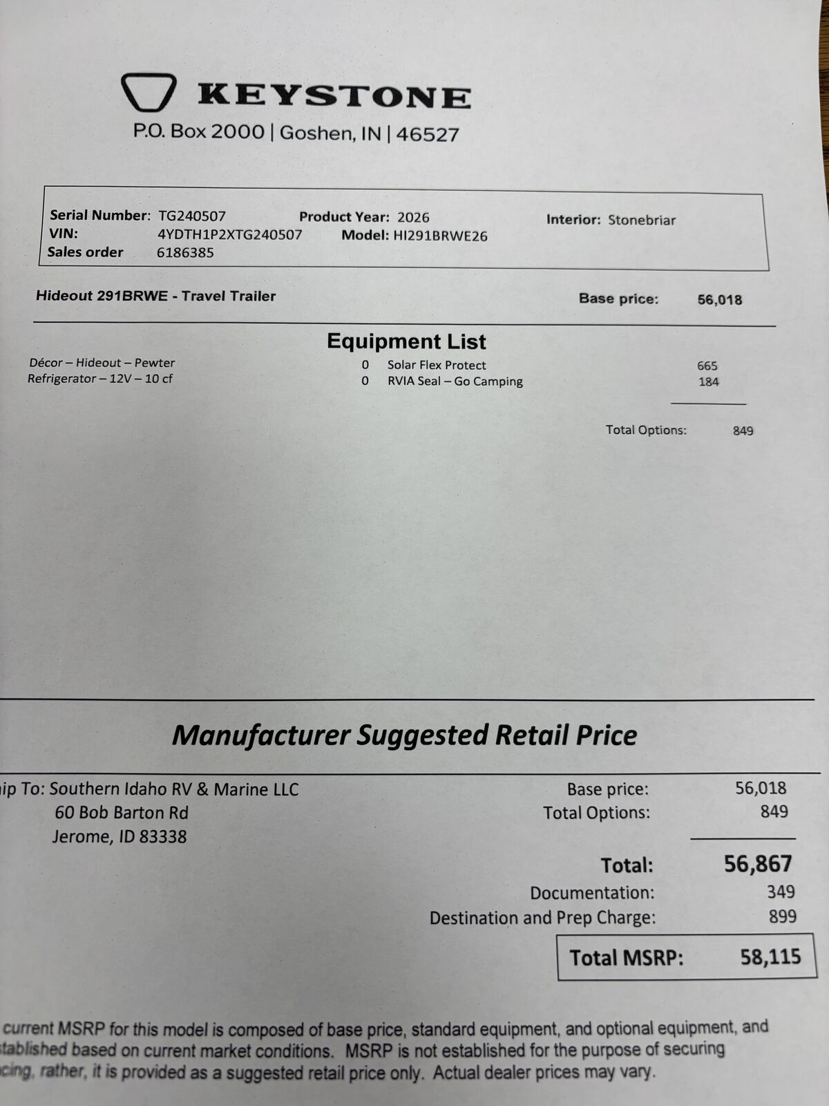 SHOP YOUR LOCAL DEALER, CHECK THE INTERNET, Our price is the best! Southern Idaho RV & Marine is offering for a LIMITED TIME ALL our Brand-New Keystone Hideouts in stock, at our cost! CALL ABOUT ADDITIONAL FLOORPLAN IN STOCK! We are a local family-owned dealer, with low overhead and non-commissioned salespeople.