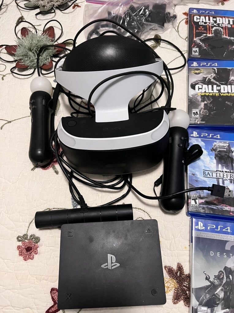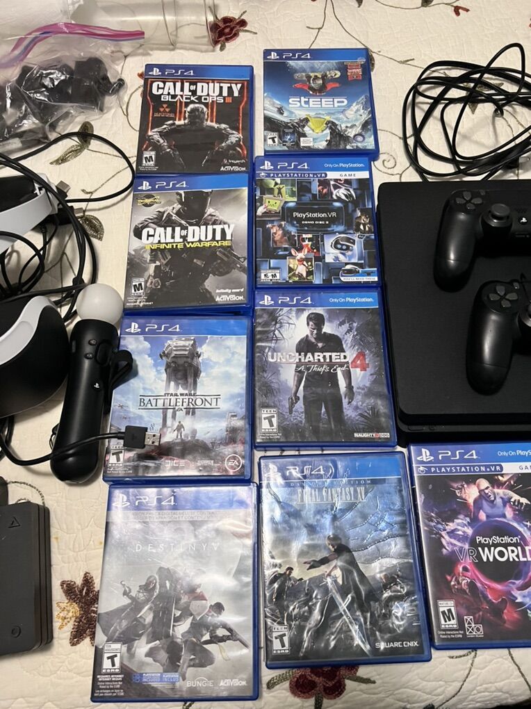 ApplePayPS4 w/two controlers VR set w/two joy stick 10 games a camera set and gaming head set.