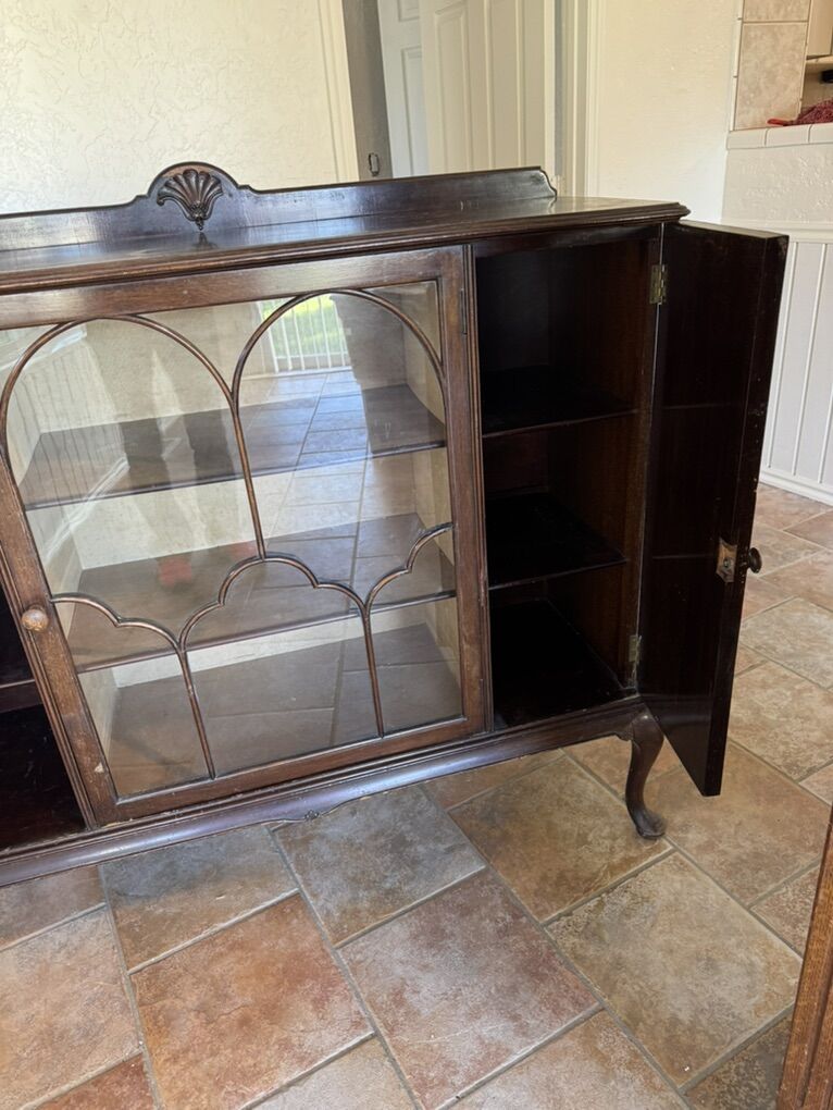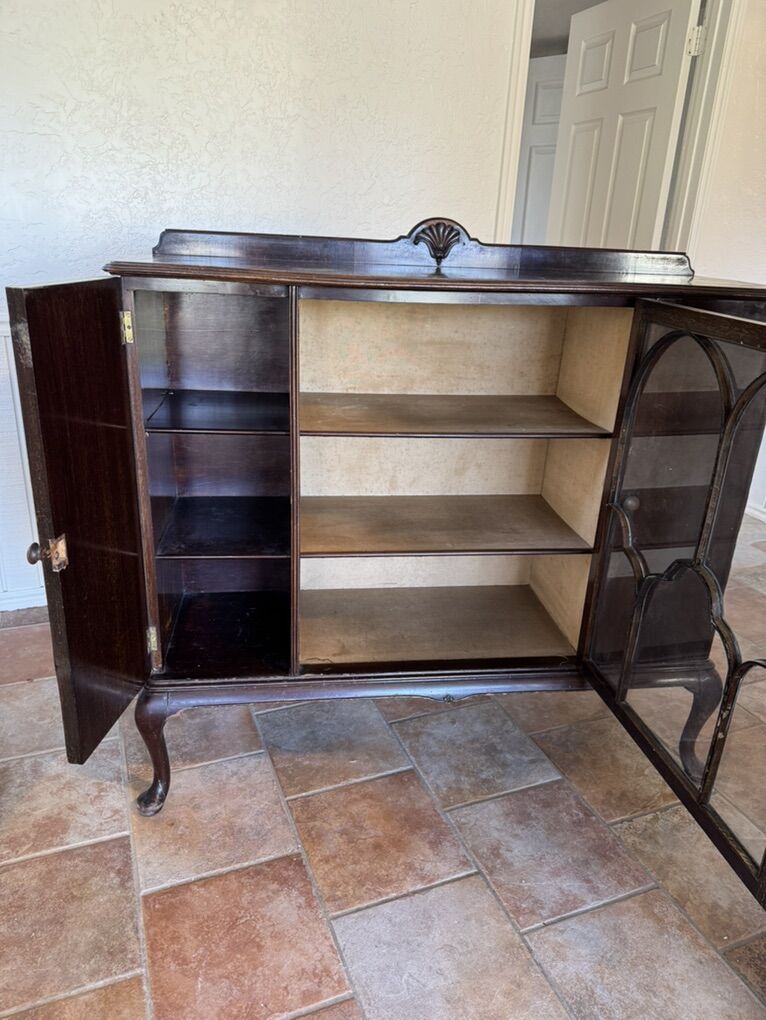 Venmo Antique curio, side, board buffet, wood and glass.  42 inches high 16 inches deep 48 inches wide.