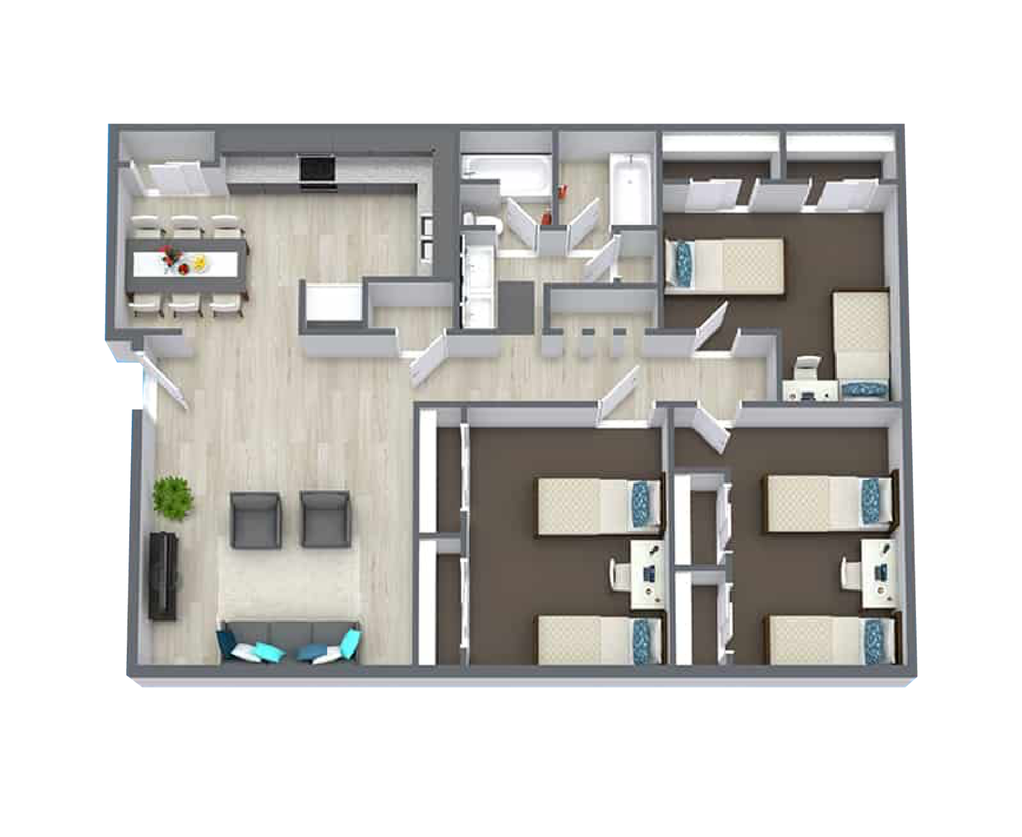 6 person apartment with shared rooms/bathrooms, lots of space with huge included TV and kitchen. Completely furnished
