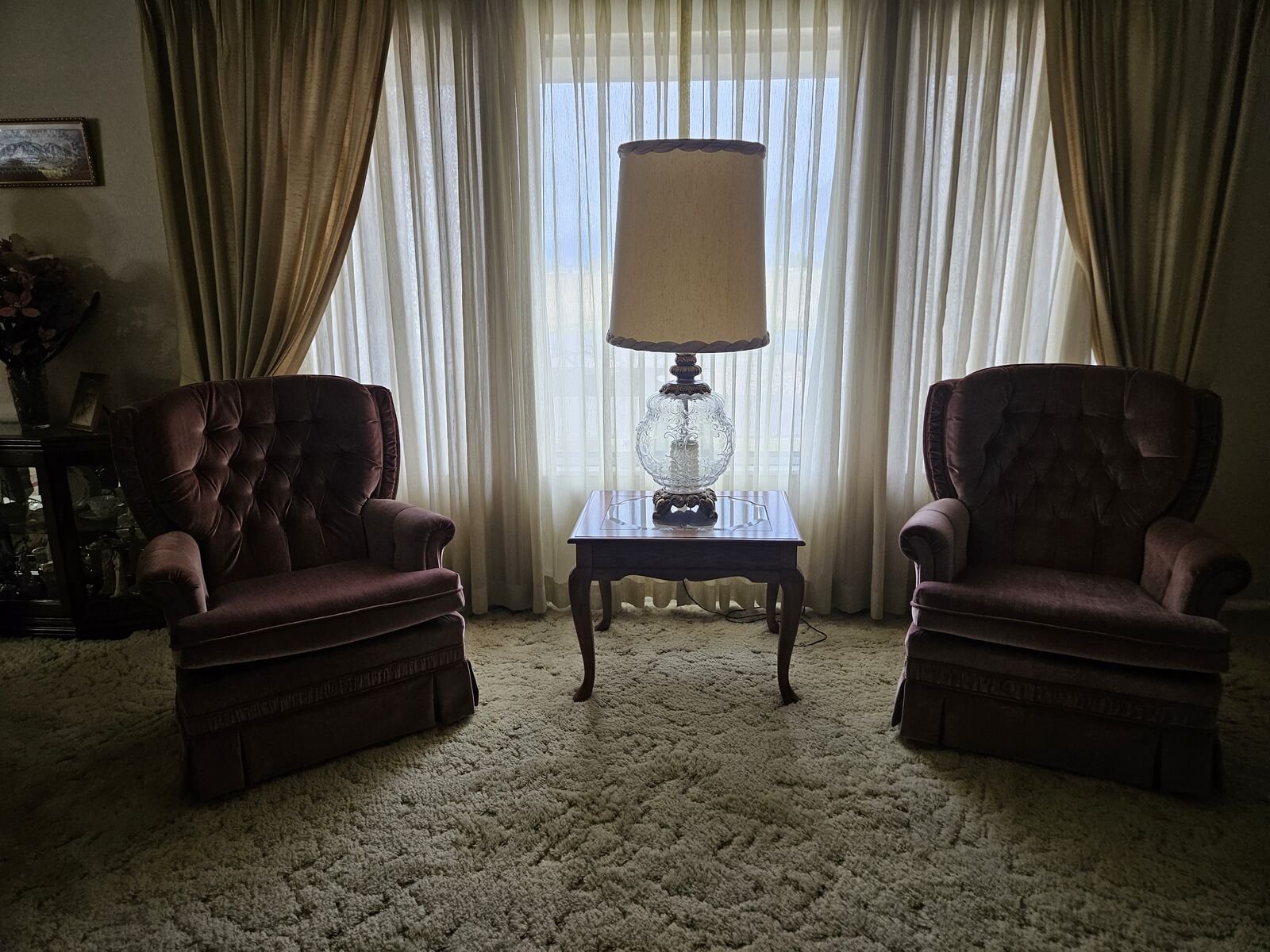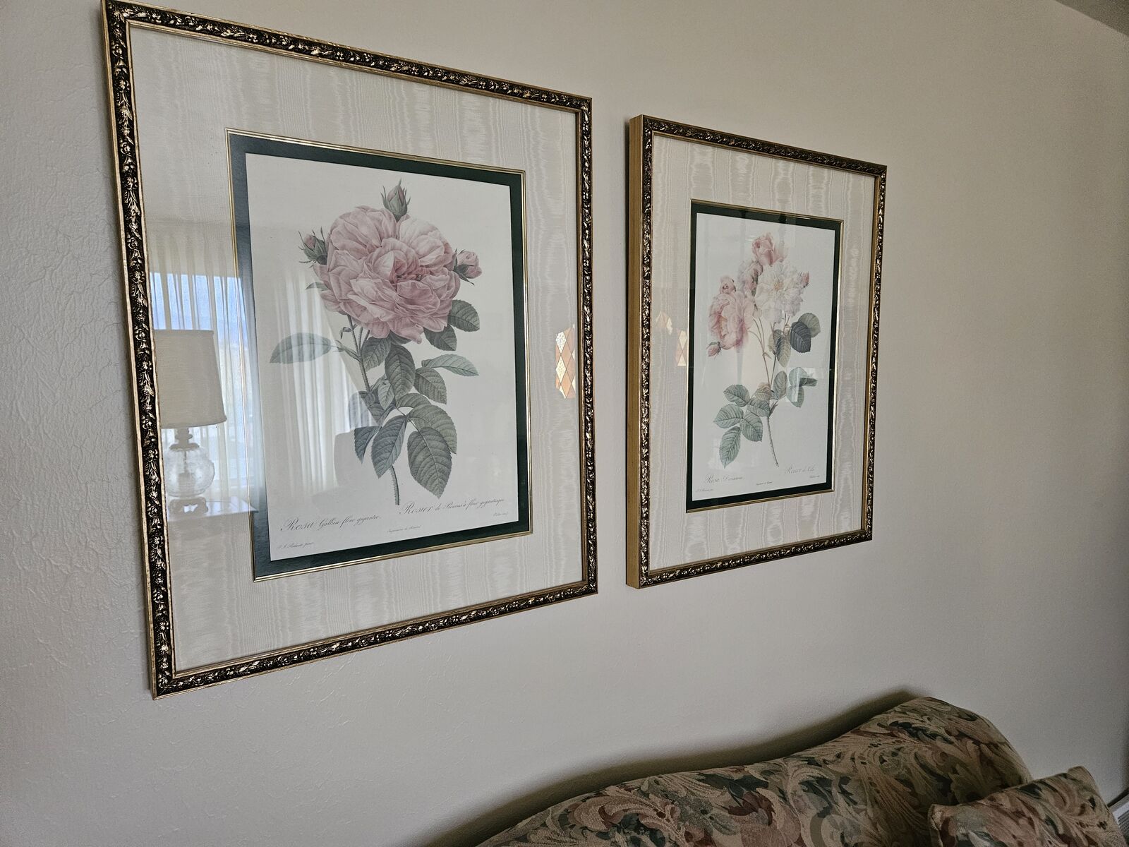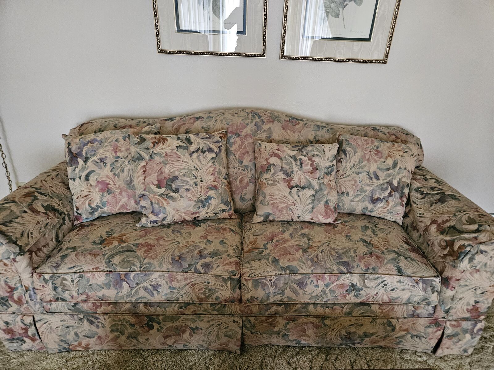 Charming floral vintage living room set. Floral couch with matching pictures. Unique coffee table with glass center and matching end table. Two pink arm chairs in exceptional condition. Antique lamp with glass center.