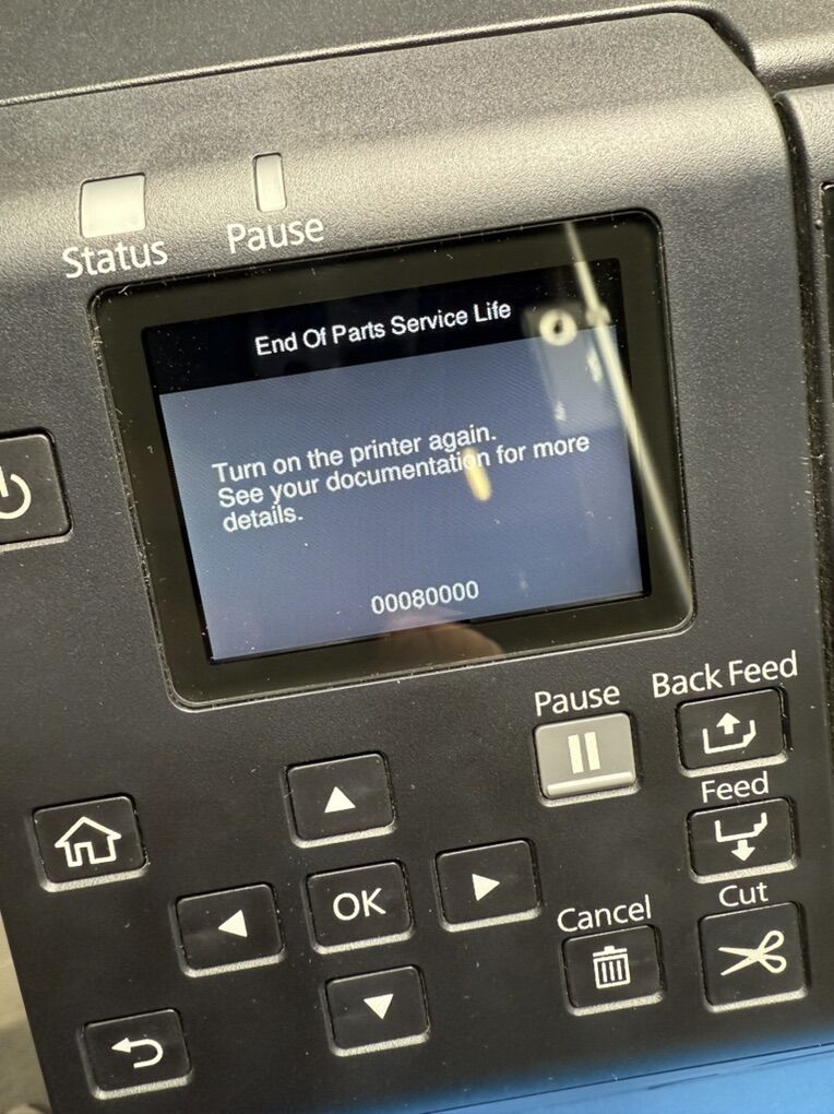 Venmo++++ UPDATE WE ARE TOLD THIS COULD BE A PRINTER WASTE INK CARTRIDGE THAT MIGHT NEED TO BE REPLACED - PRINTER HAS BEEN SITTING FOR ABOUT A YEAR - IT WAS PULLED FROM WORKING ENVIORMENT - NOW HAS A SERVICE CODE THAT NEEDS TO BE RESET - THE ERROR CODE IS 00080000. THIS HAS TO BE DONE BY A AUTHERIZED TECH - APPROX COST IS $150 - $300 - UNIT WORKING VALUED AT $2500 - $3500 TESTED WORKING - SO WE FEEL THIS IS A FAIR PRICE YOU FIX - IF YOU NEED ADDITIONAL PHOTOS ECT - PLEASE LET US KNOW. CALL - TXT OR KSL MESSAGE ANYTIME ASKING $600 OR BEST OFFER BEING SOLD AS PARTS REPAIR - WAS PULLED FROM WORKING ENVIORMENT - WE DO HAVE EXTRAS ( PRINTING PAPER ECT ) CALL ANYTIME 801-941-8460