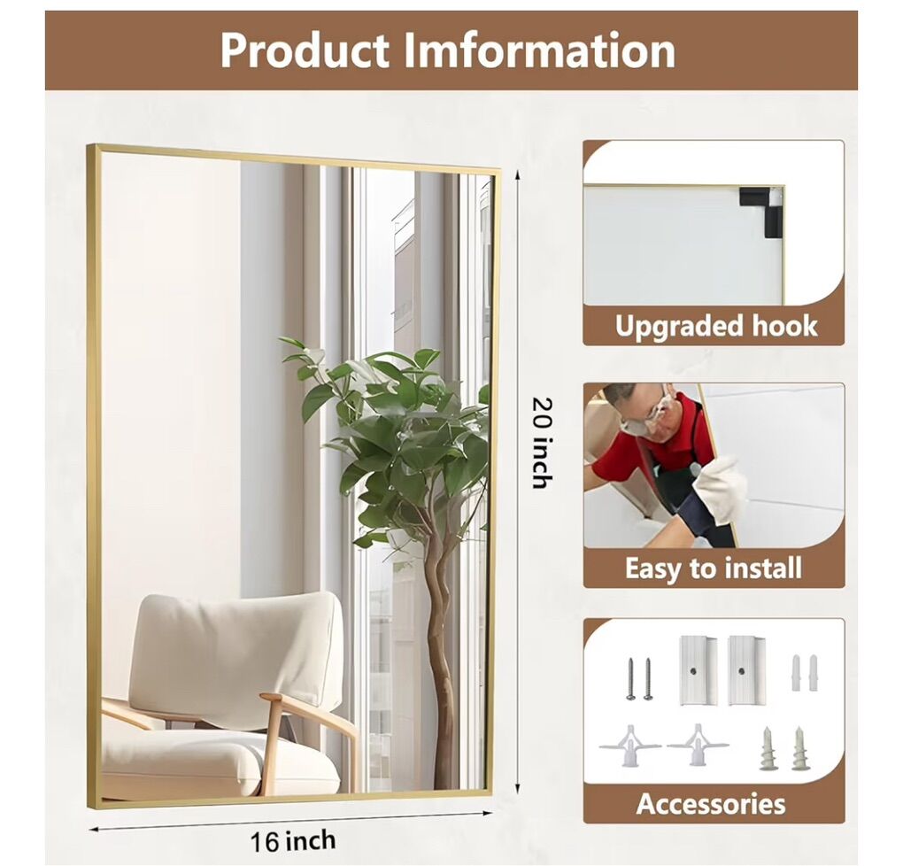 Gold Bathroom Mirror, 16x20 Rectangle Mirror, Brushed Gold Mirror, Metal Frame Square Corner Vanity Mirror, Wall Mounted Mirror for Modern, Living Room, Bedroom, Horizontal Or Vertical