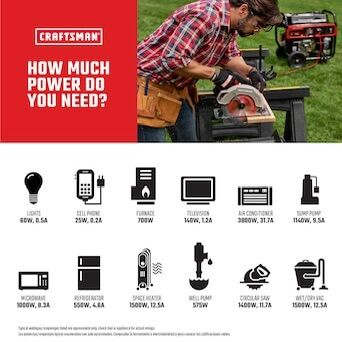 VenmoDuring the next power outage, keep your lights on and appliances running with the CRAFTSMAN 5000 watt generator. The never-go-flat wheels and a fold-out handle allow you to take your generator anywhere - from home improvement projects to activities outdoors. Four 120V household outlets and one 120/240V 30A locking outlet allow you to keep multiple items powered at once. 5000 Running watts and 6250 starting watts allows you to power most of your household items during an outage Briggs and Stratton 306cc engine for easy, reliable starting CO DETECTION technology shuts down the generator when harmful levels of CO are detected Four 120 volt household type outlets and one 120/240 volt 8.5 gallon fuel tank provides up to 15 hours of run time at a half load allowing you to refuel less often Wheel kit and handle included for easy maneuverability