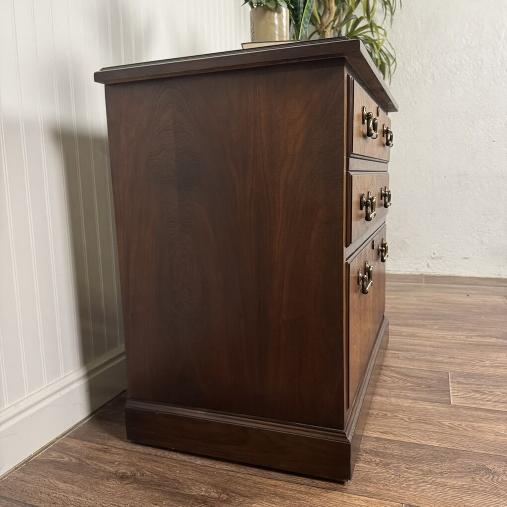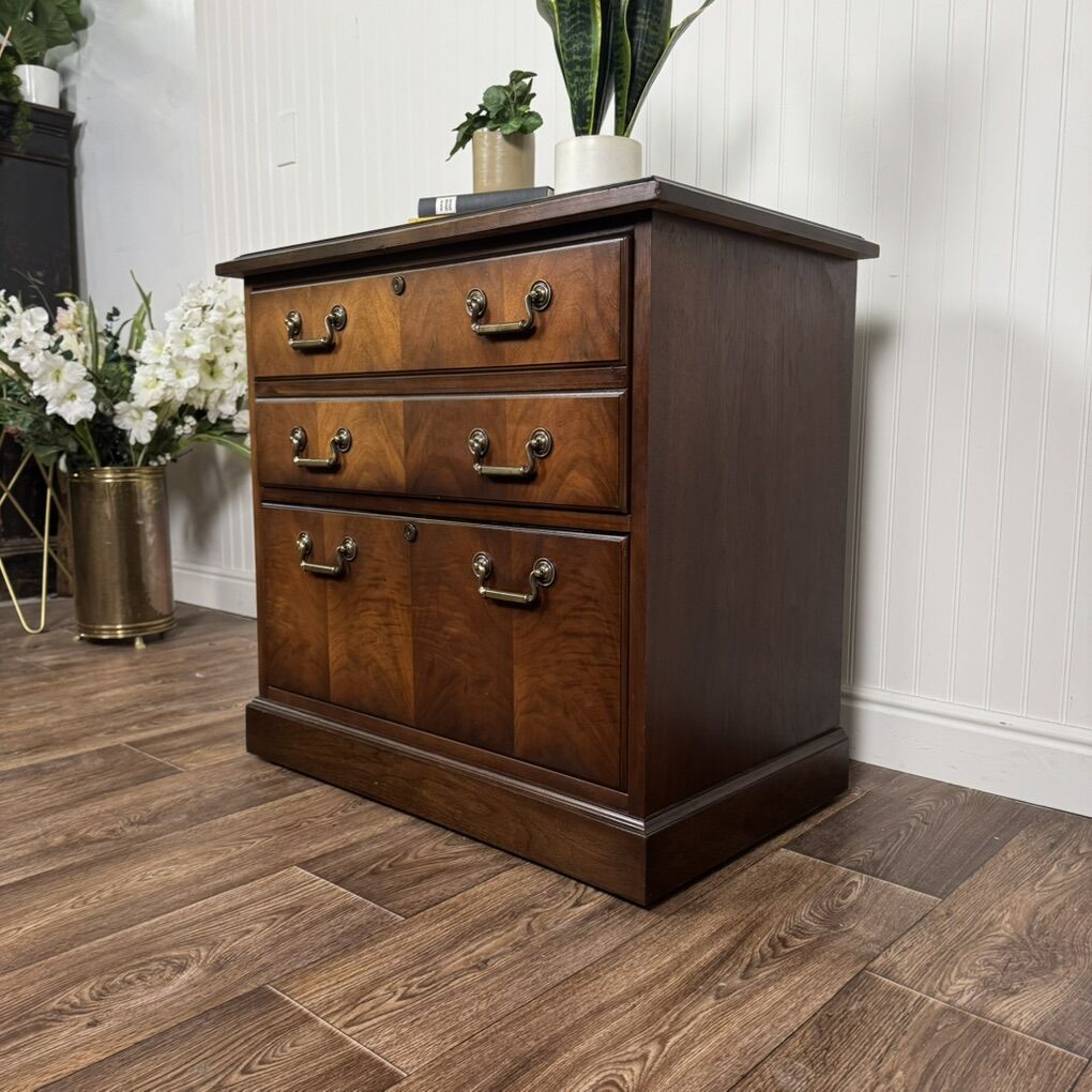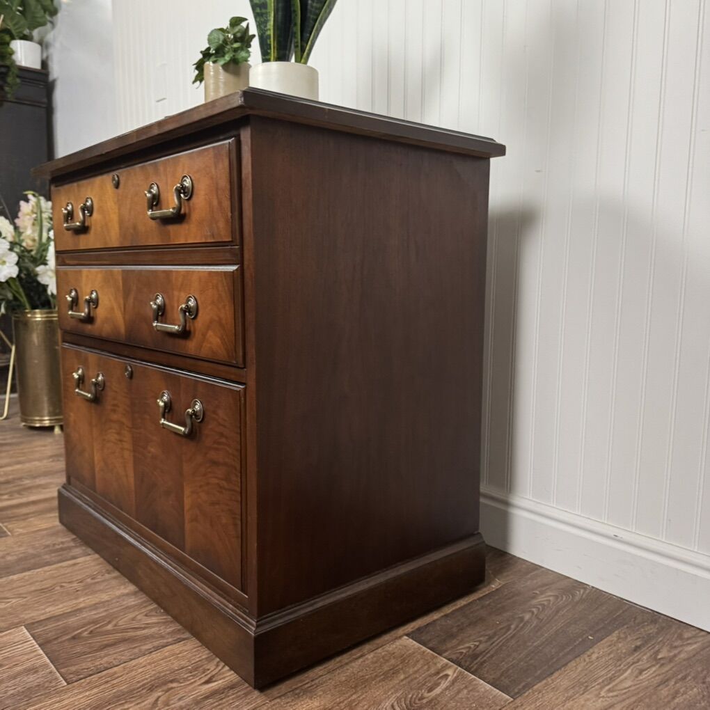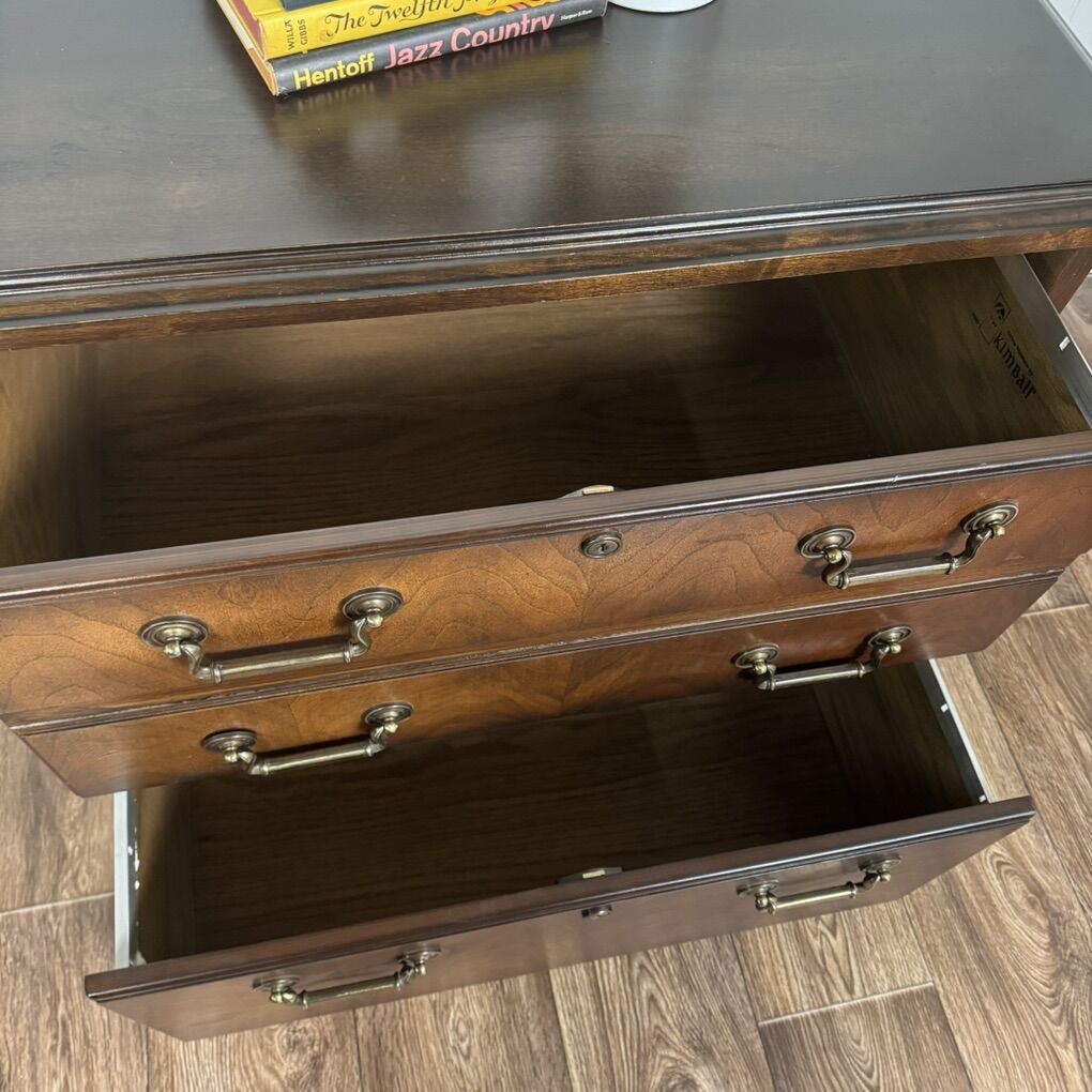 VenmoBeautiful vintage solid wood lateral filing cabinet by Kimball, a well-known maker of high-quality American office furniture. Features bookmatched cathedral-grained veneer fronts, smooth-gliding drawers, a rich, medium-dark wood tone, and elegant brass hardware.