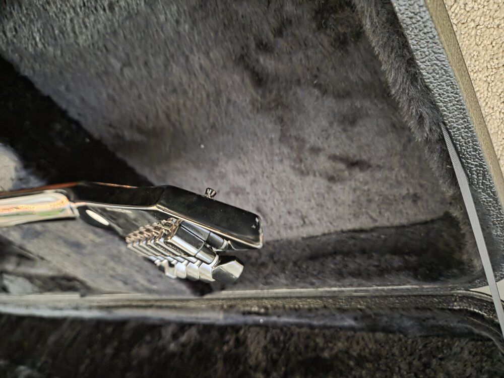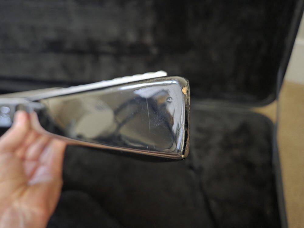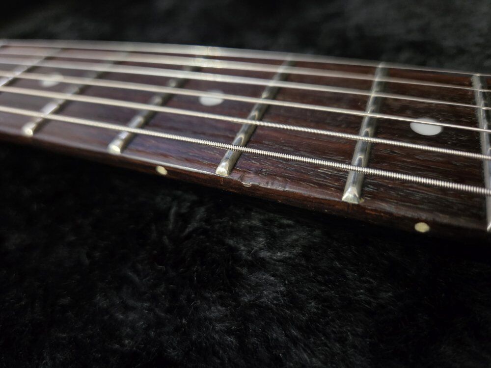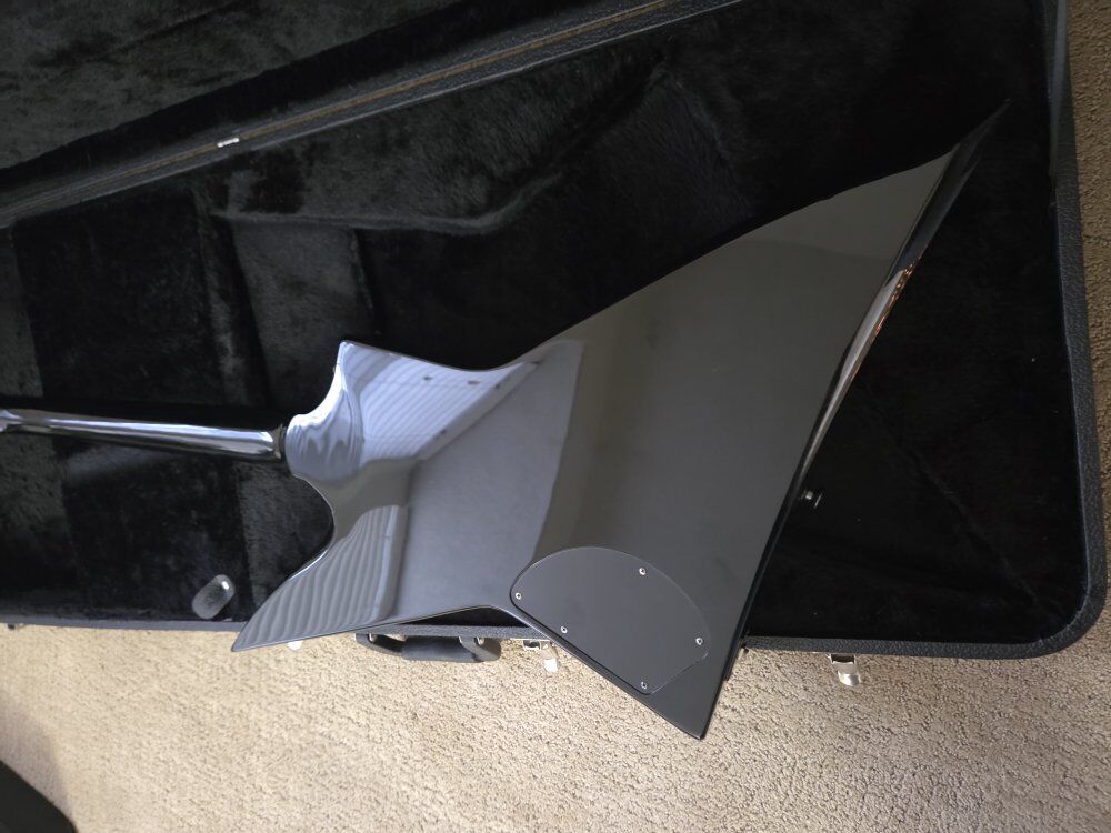 Great condition for a pointy guitar that's 23 years old. Some fret wear focused on the first few frets, see later pictures. Some knocks and light damage on the back point and the headstock, also pictured. Another ding on the bass side of the fretboard at the 8th fret but hard to see from more than a few feet away and I don't feel it when playing.