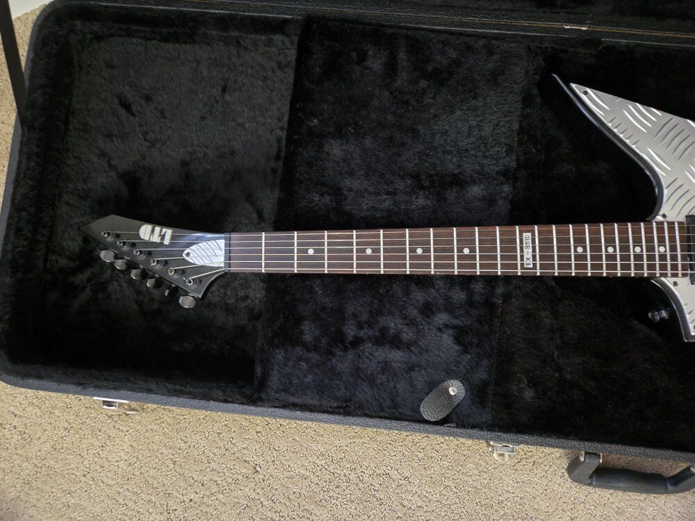 PayPalOriginal owner, smoke free home, gigged maybe twice ever. Really solid guitar, big chunk of mahogany that excels at laying down heavy clear riffs. Set up for standard 10-46s now but would do well tuned down. Hard ESP case included. Upgraded pickups are an awesome EMG 81/89 set (89 is an 85 plus splittable to a single coil by pulling up on the volume knob).