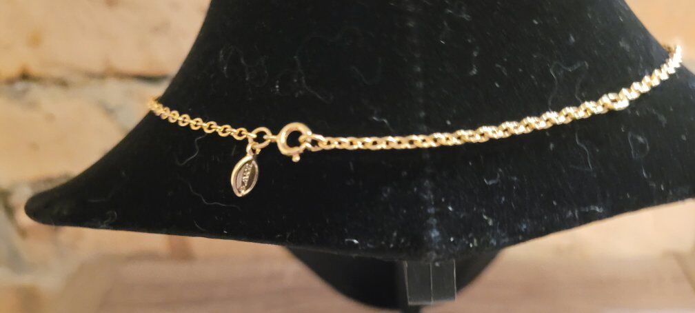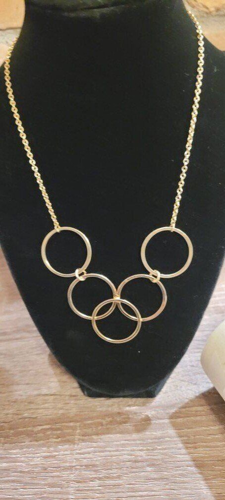 Vintage signed AVON gold tone interlocking circles necklace in excellent pre-owned condition. There are (5) circles each measuring 1”. Total length 18”