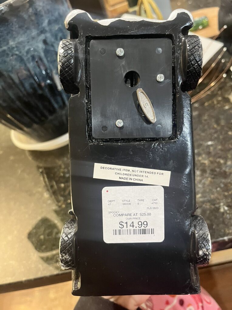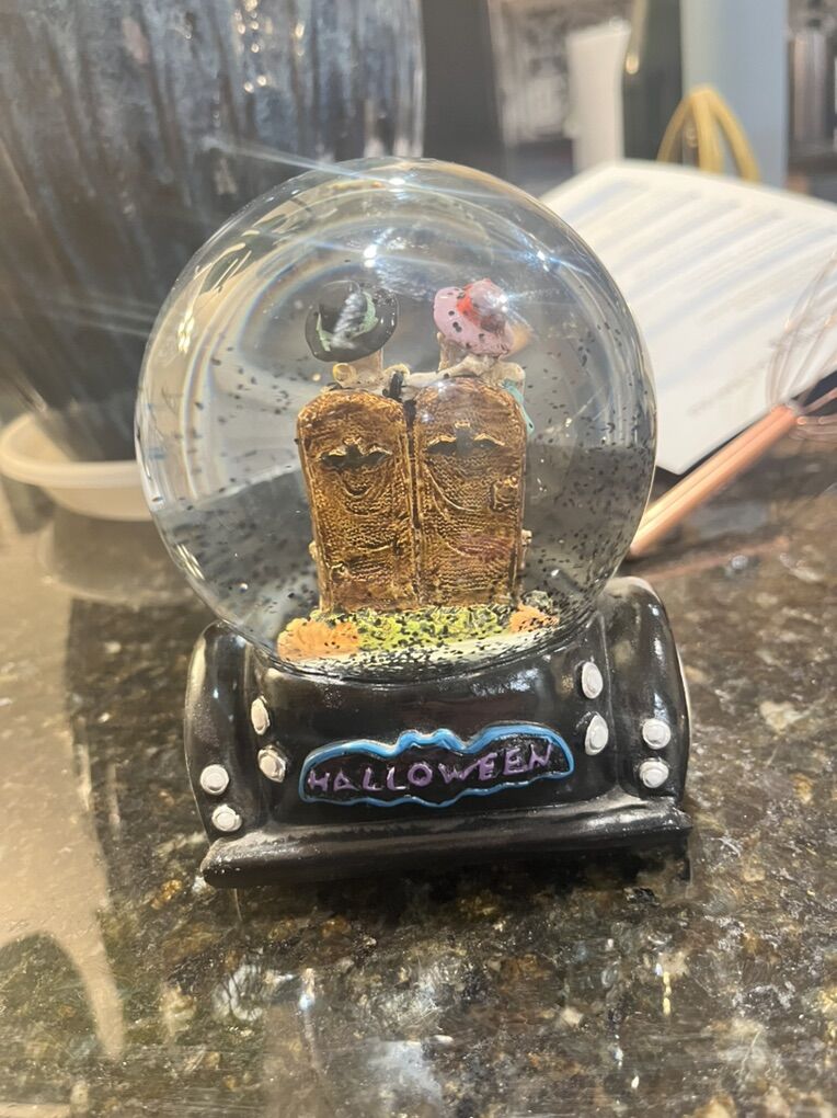 VenmoSnow globe with a two skeletons in a black car. The snow in the globe is black glitter. Bought for $15, asking for $5.