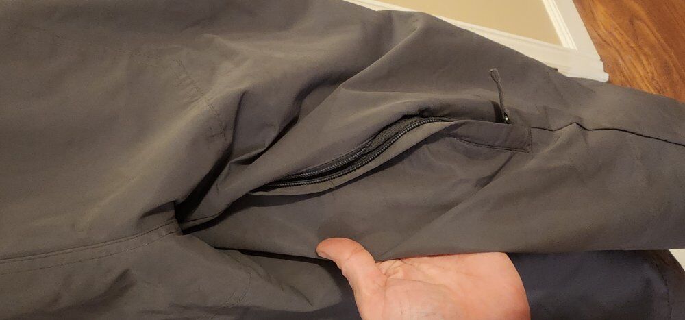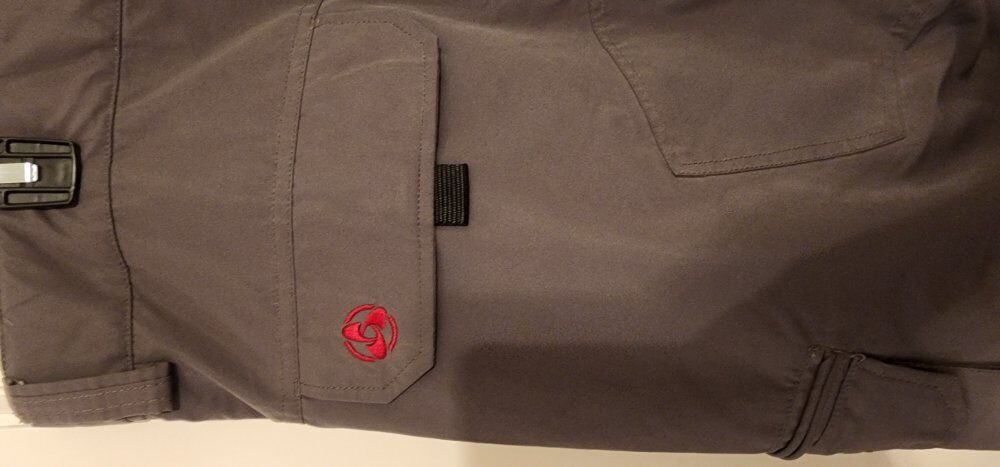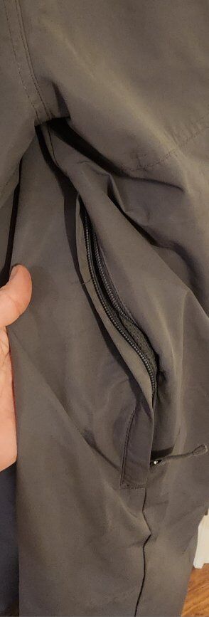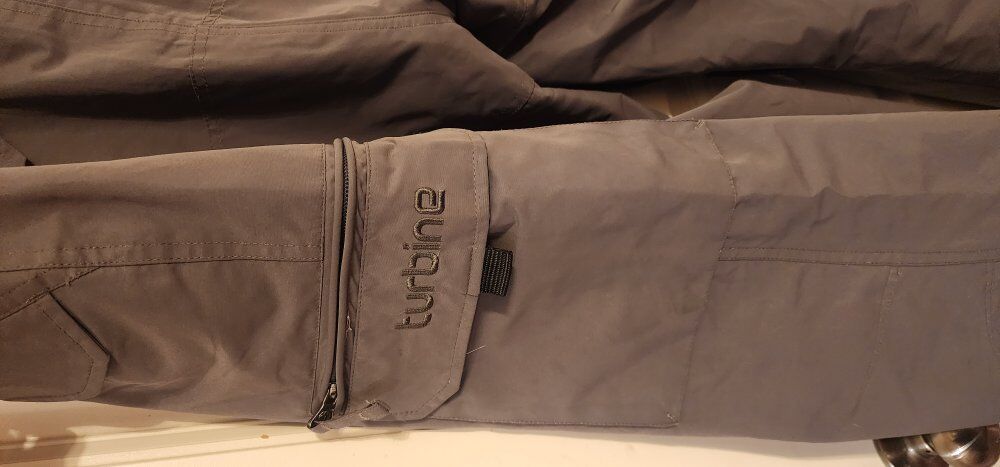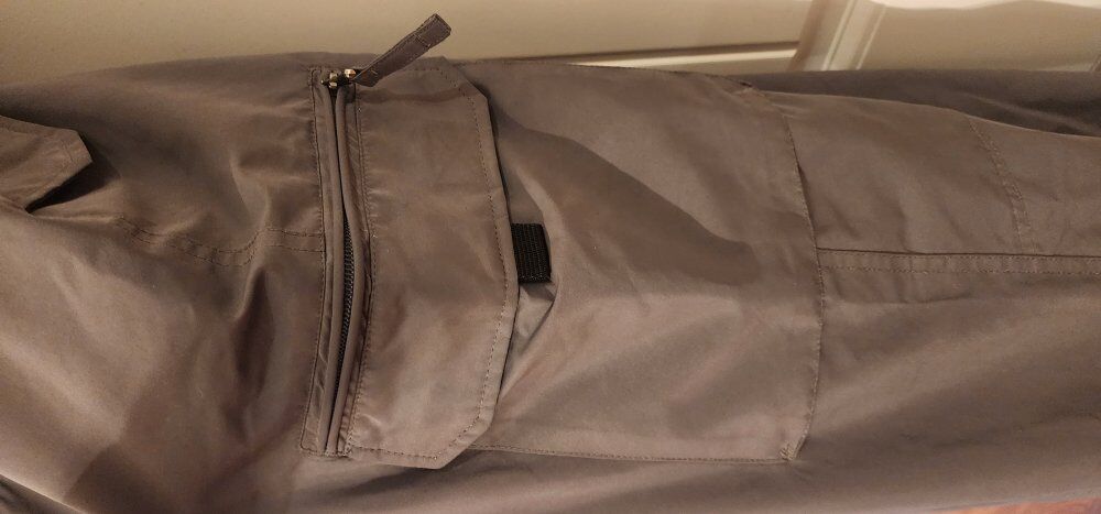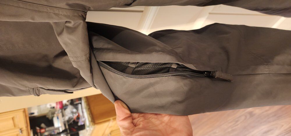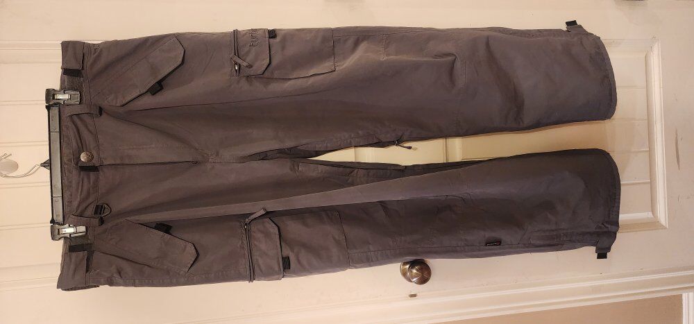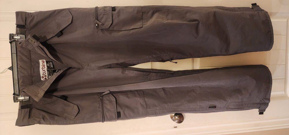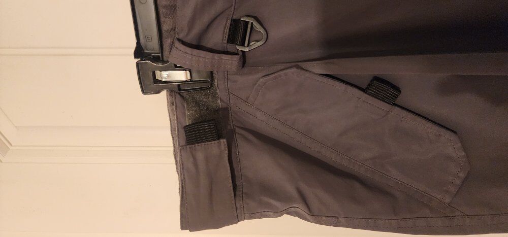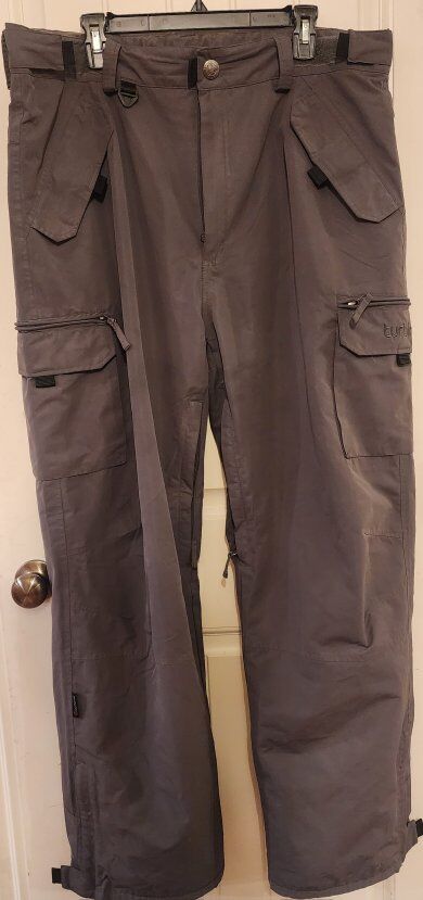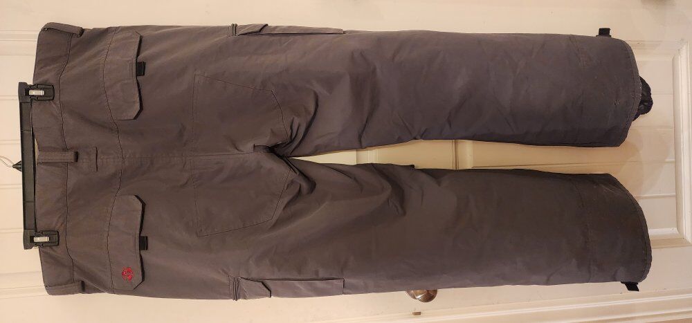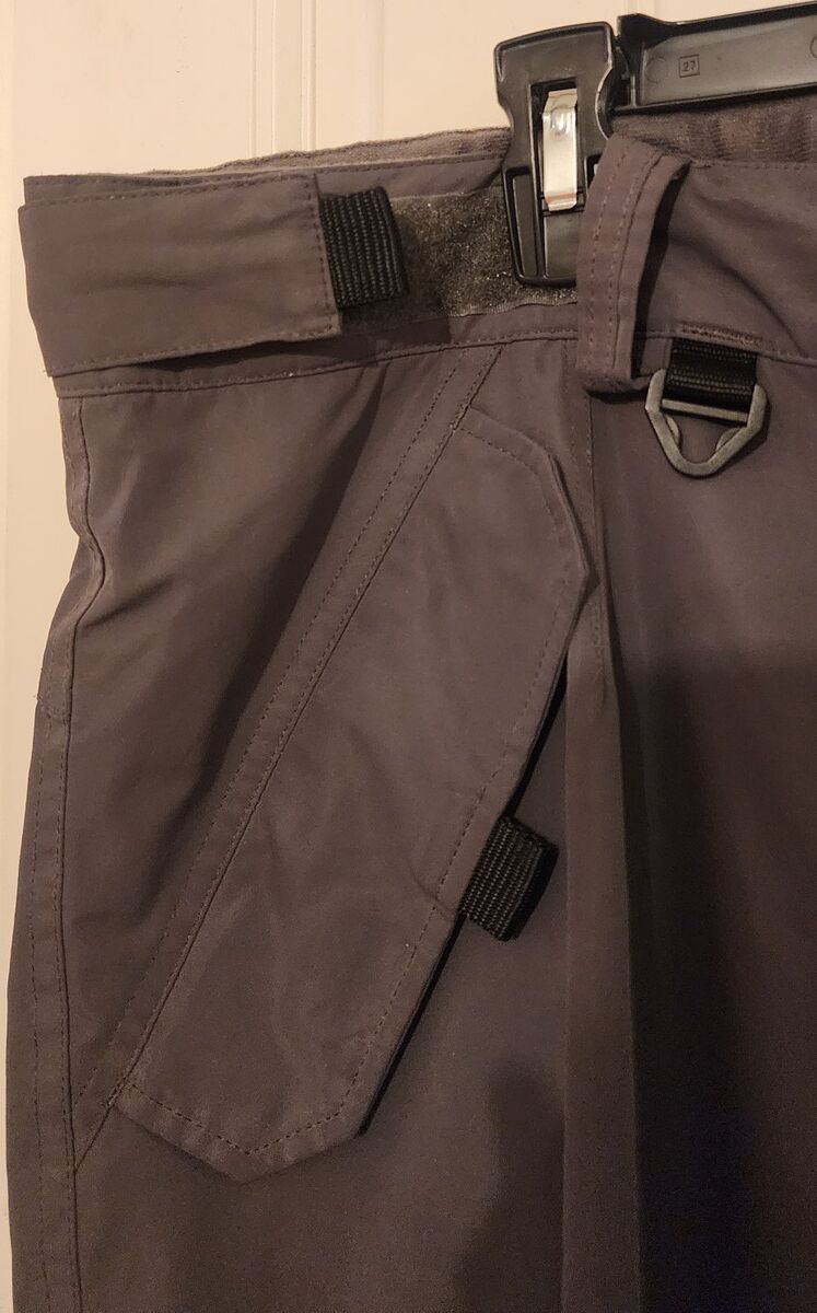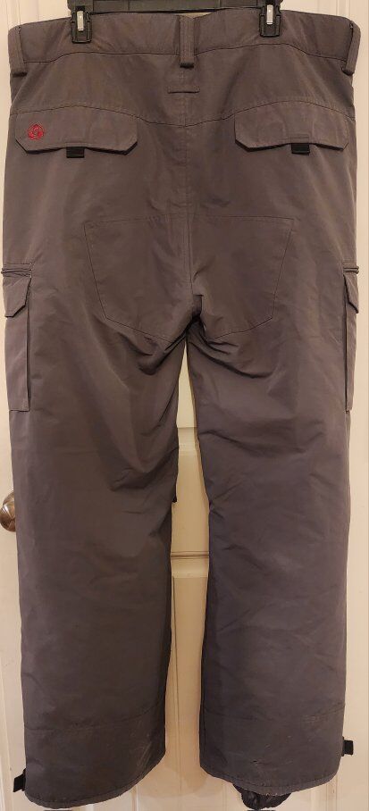 Waterproof, seam Sealed, gaiters, lots of pockets, lined for warmth, thigh vents.