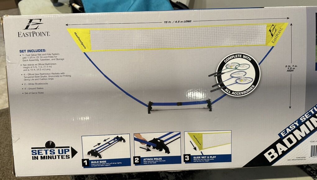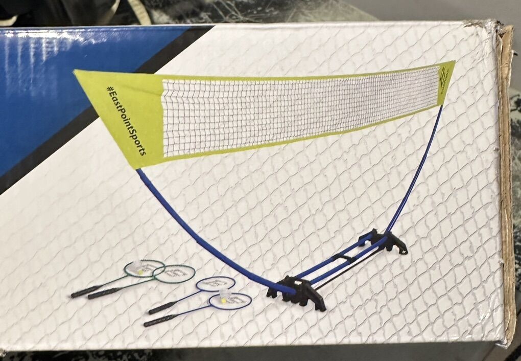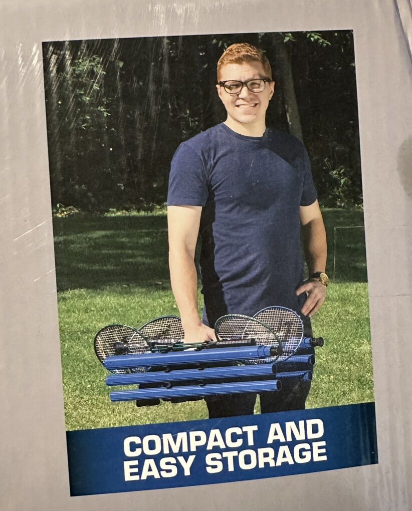 VenmoFast setup net and pole system. Brand new! Never opened. Compact and easy to store. Net stands at official badminton height. Official size badminton rackets with tempered steel shafts.