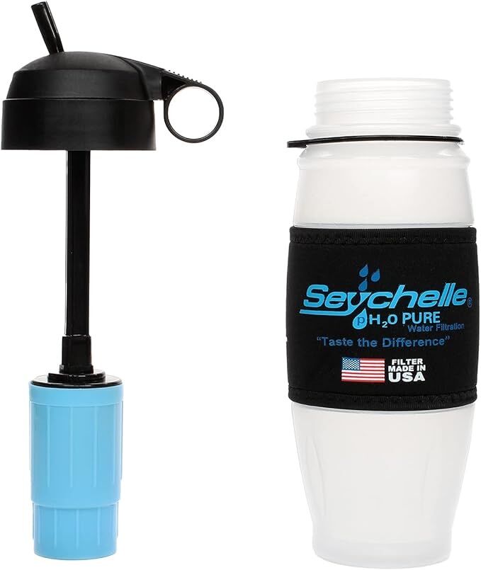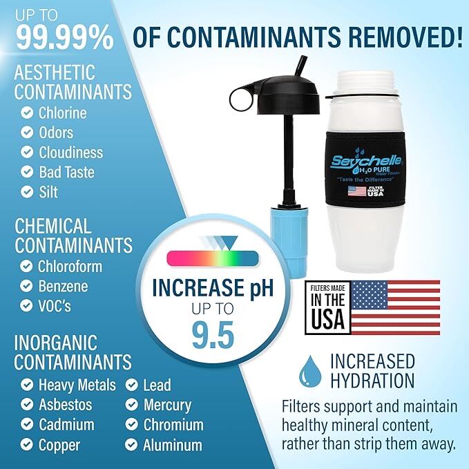 This high end portable water bottle allows you to drink from virtually Any contaminated water source in the world (Not Intended for Saltwater Use). The Rad/Advanced water filter also removes up to 99.99% of Radiological Contaminants.