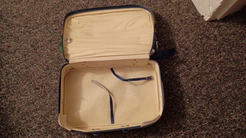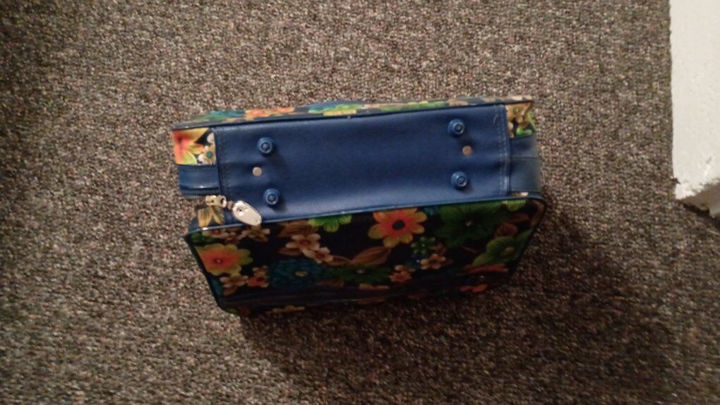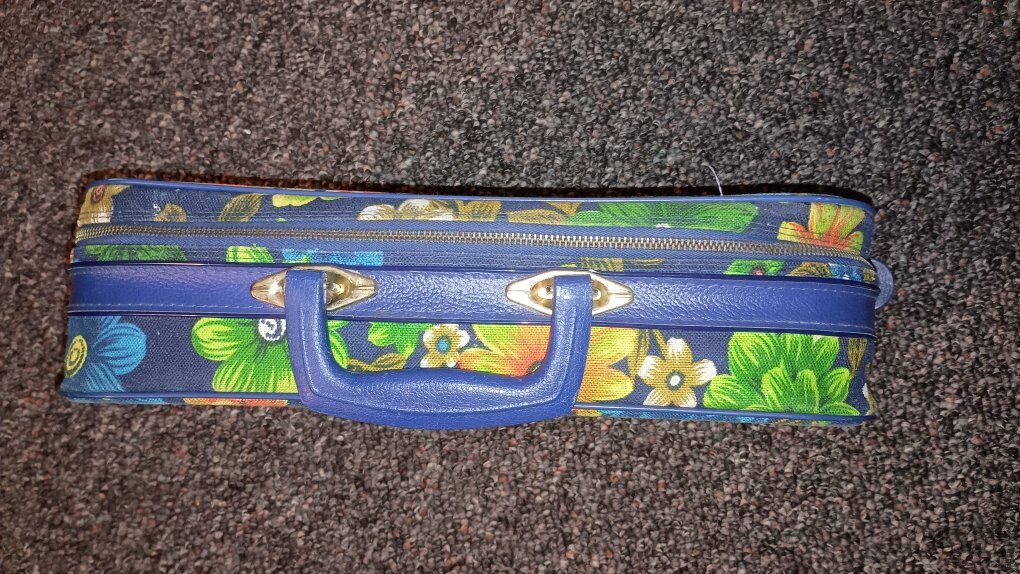vintage 1970's small flowered suitcase. used. 10 1/2"x1'1"x4". includes key for lock. zipper side pocket