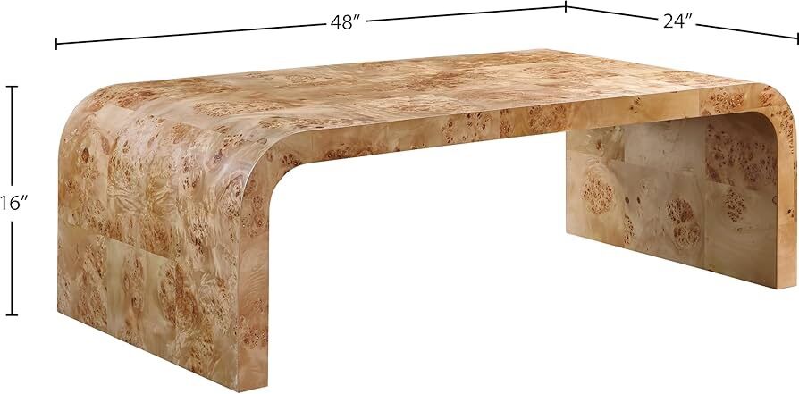 New in Box!!! Meridian Furniture 269-C Cresthill Collection Mid-Century Modern Coffee Table with Ash Burl Wood, Natural Ash Finish, Curved Art Deco Design, 48 W x 24 D x 16 H, Natural