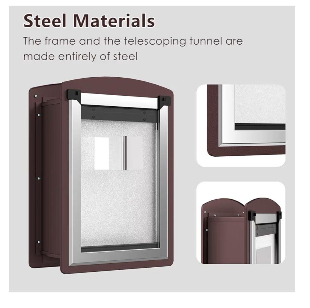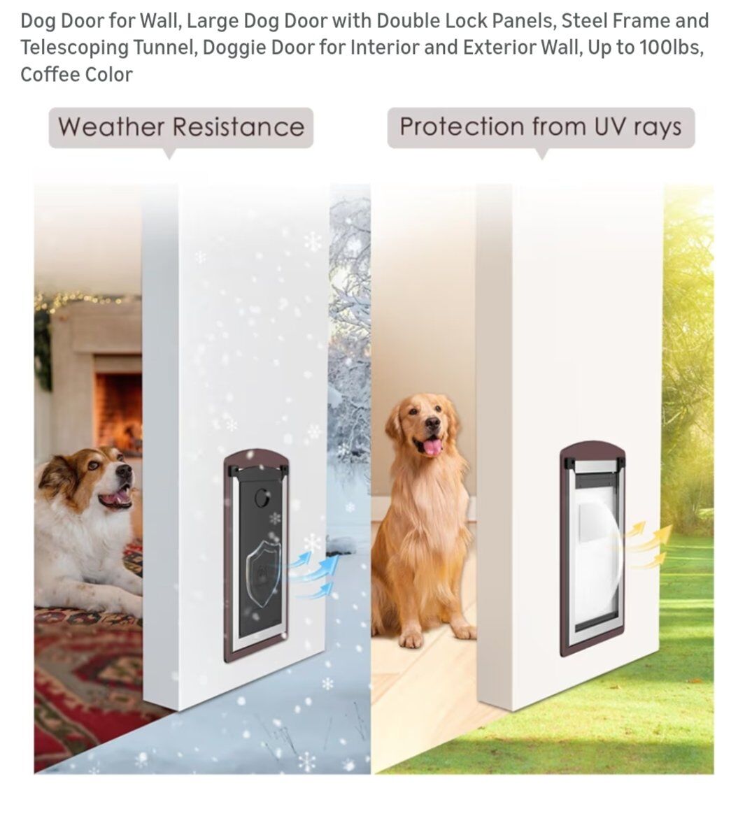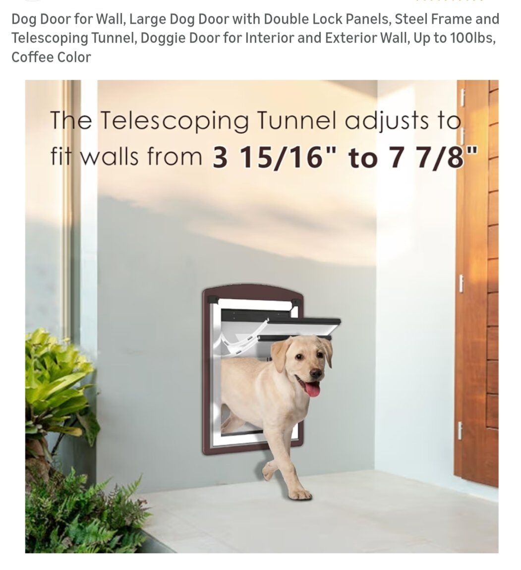 VenmoLarge dog door to pass through walls 4" to 7-7/8" thick walls. Frame is brown with two door flaps to insulate from the weather. See pictures for specs. Bought to put in wall but didn't end up using it. Opened box but I didn't use or remove any parts.
