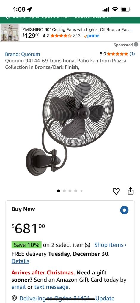 New in Box!!! Patio Fan from the Piazza collection Height: 22.25 inches Width: 18.00 inches Style: Transitional Light Type: Patio Fan Finish: Noir Safety Rating: Damp and Safety Listing: Damp