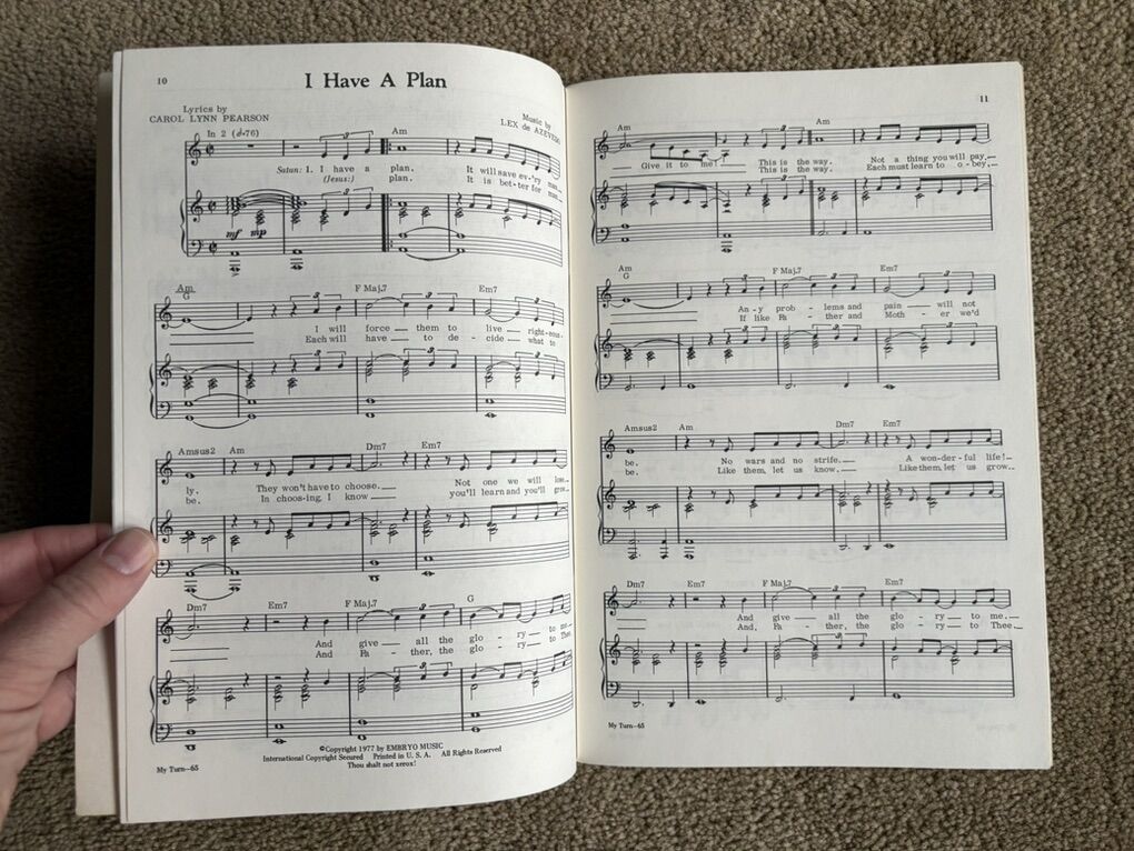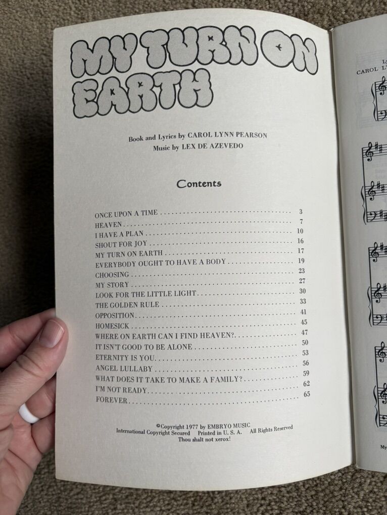 Vintage My Turn on Earth vocal score and piano accompaniment, by Carol Lynn Pearson and Lex de Azvedo. A Contemporary Family Musical. Embryo Music, 1977. Excellent condition. No marks or damage. Text only. Cash or Venmo.