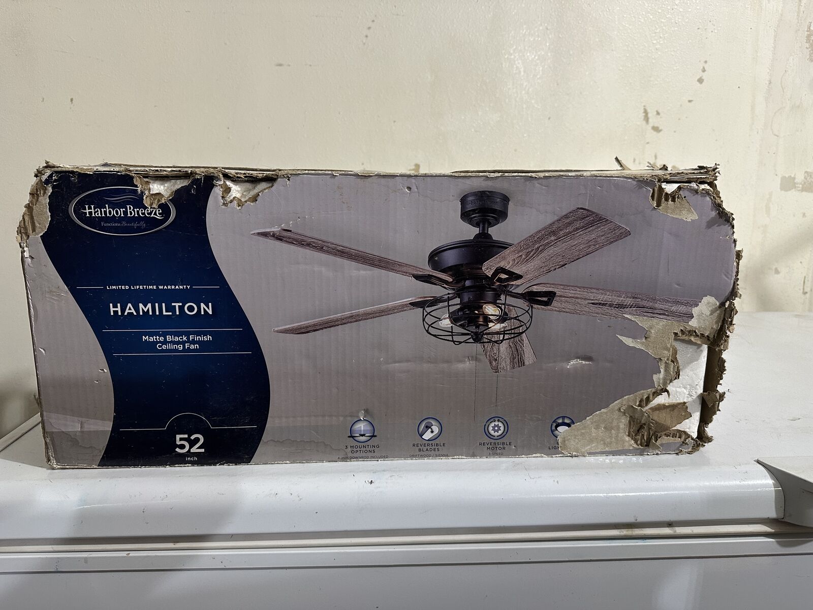 52 Hunter Ceiling Fan. Changed our mind with a remodel and then it got kicked around in the garage. All major hardware is there, but cannot guarantee that it isnt missing a small bag of screws. Asking $70 OBO 4358810352 Sold new at Lowe's for $163. https://www.lowes.com/pd/Harbor-Breeze-52-in-Matte-Black-LED-Indoor-Ceiling-Fan-with-Light-Kit-5-Blade/1002102484?store=&cm_mmc=shp--c--prd--dcr--ggl--CRP_SHP_PLA_DCR_Online_High_Priority(A-D%2BPriority+Items+CL3)Omni--1002102484--online--0--0&gclsrc=aw.ds&gad_source=1&gad_campaignid=22861950129&gbraid=0AAAAAD2B2W9NRtJNX51hJJtNdQZs7oF_T&gclid=EAIaIQobChMItoOfgKrXkQMVYyhECB0HJShNEAQYASABEgLSdfD_BwE