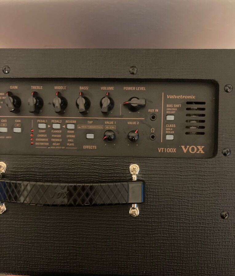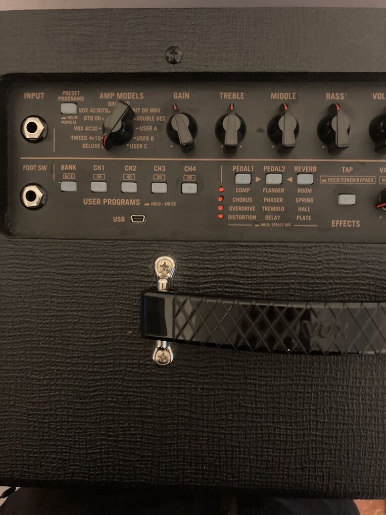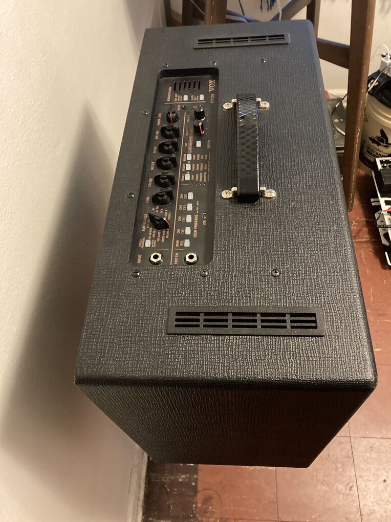 8 hard wired + 3 custom programmable onboard classic tube amp emulations, from Fender, Vox, Marshall, & Mesa Boogie. 3 play modes, the middle one excludes any Digital modeling. 12 effects, tap tempo, noise gate, & many tube biasing options. Tube preamp, solid state, & digital modeling. Great tube amp emulation & touch sensitivity. Factory reset, this amp is designed around an online app called Vox ToneRoom. ToneRoom is an editor / librarian for Vox products. Connect a comparable product to your iPhone or computer via a USB cable to edit tones, manage user programs, & back them up. This amp sounds huge. It has the original 12ax7 tube in it. I’ve priced low enough for a buyer to run it past a qualified tech for a check over, maybe new tube, & a volume mismatch diagnosis. It’s near a 6 year old amp (2019) that saw near 2 years of play. It has one volume issue, I don’t know if it’s user error, solved with a proper tone room set up; or something an amp tech fixes. The issue is this; If I switch to another amp setting under play, it jumps to near full volume. That is a serious issue if any random kid had access to that knob under play, like at guitar center. Touching gain control immediately brings volume back down to settings. Often this volume issue doesn’t happen if I mute my guitar strings before I move the selector knob, & wait a sec. to notice the amp resets it’s preamp tube power levels, then I’m back to playing, at volume setting level near immediately. So that issue doesn’t effect normal playing for me, at factory reset, without having connected tone room, or created any settings whatsoever. Average used price is $350ish. Great amp, & still a popular platform.