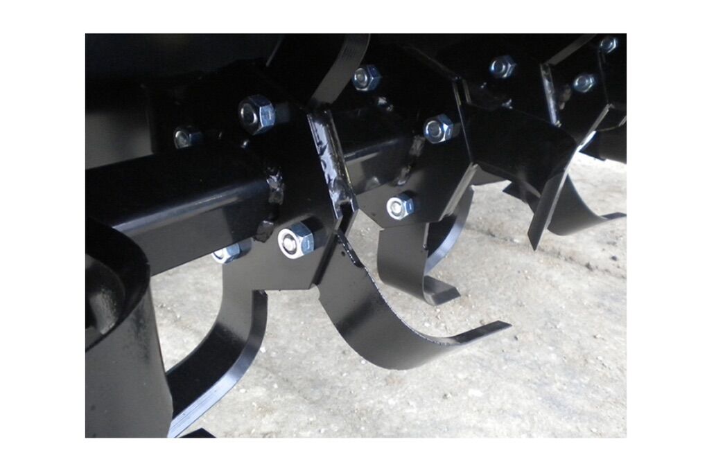 Universal mount Tilling widths of 68″ and 76″ Works in forward and reverse Double edge replaceable tines Does not require high flow Tilling depth of up to 6″ or 8″ 1/2″ skid plates Protected direct drive motor with a heavy duty bearing nose cone (not chain drive!) Solid round tube on leading edge for strength Hood design resists jamming 15 to 23 GPM