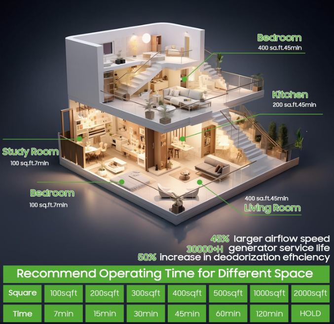 ZelleHigh Capacity Generator MachineUpgraded high capacity generator, it has max output 100,000mg/h, machine odor can cover up to 7,000 square feet of space. And it's made of metal which makes it elegant and sturdy.