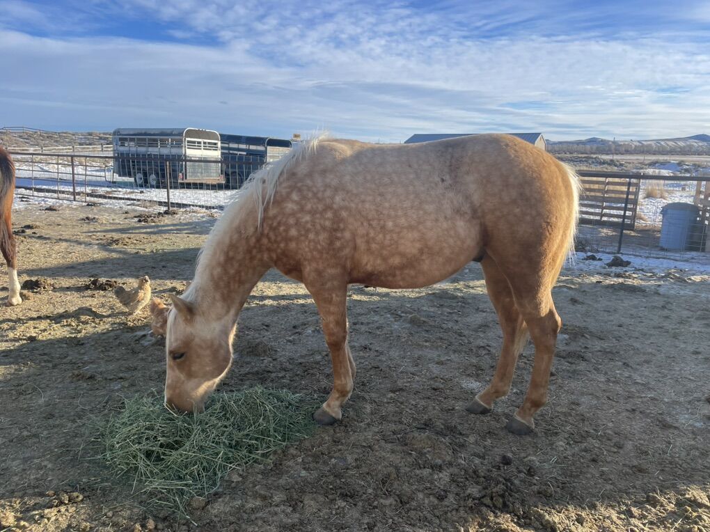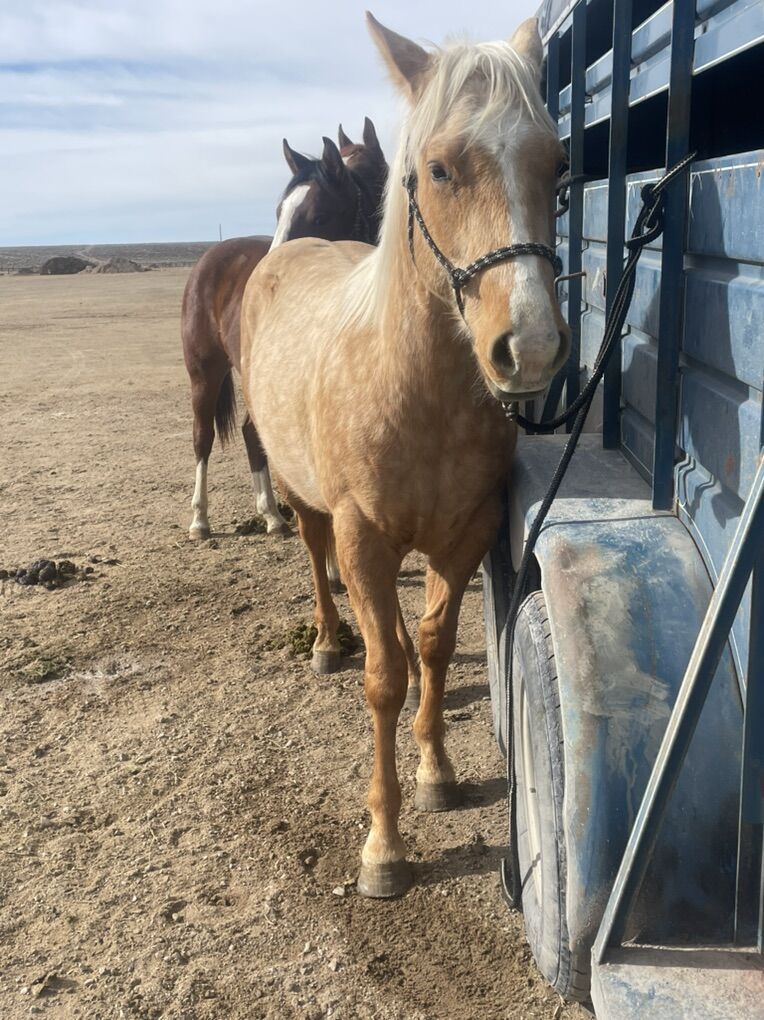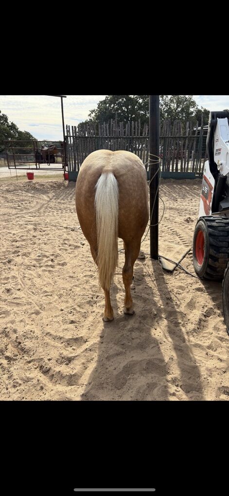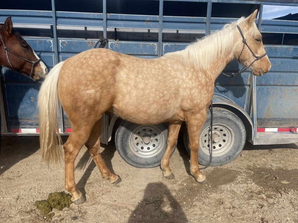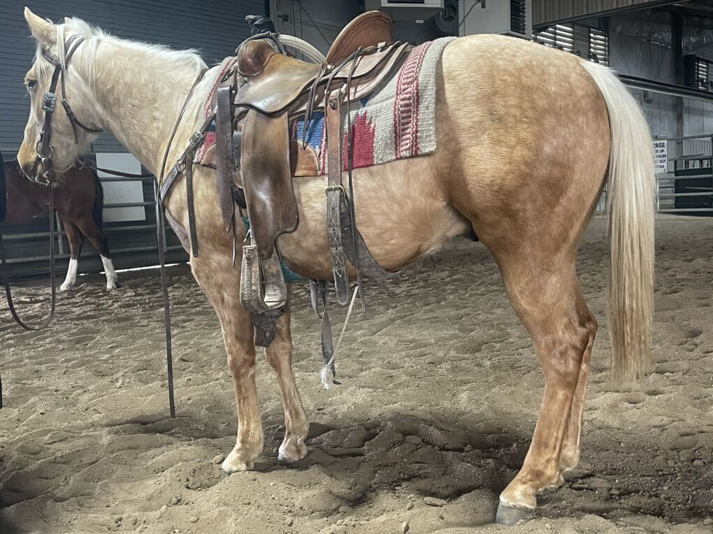 Picks up all 4 feet with ease and comfort, easy to load and saddle, stands still while getting off and on, responds well to leg pressure but is of course green. Very respectful and easy to be around. And who doesn’t love a dabbled palimino. This horse has a wonderful confirmation and will turn heads wherever he goes.