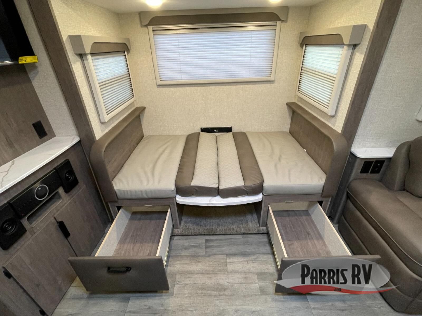 This Lance travel trailer has the best bedroom out of the entire brand! Not only do you have a private bedroom at the back of the trailer with a slide out for more walking space, but you also have a king-size bed just waiting for you to enjoy its comfort. Another comfortable feature found on this trailer is the front sofa bed. Added to the booth dinette and king-size bed, this sofa helps this trailer sleep five people during every getaway.