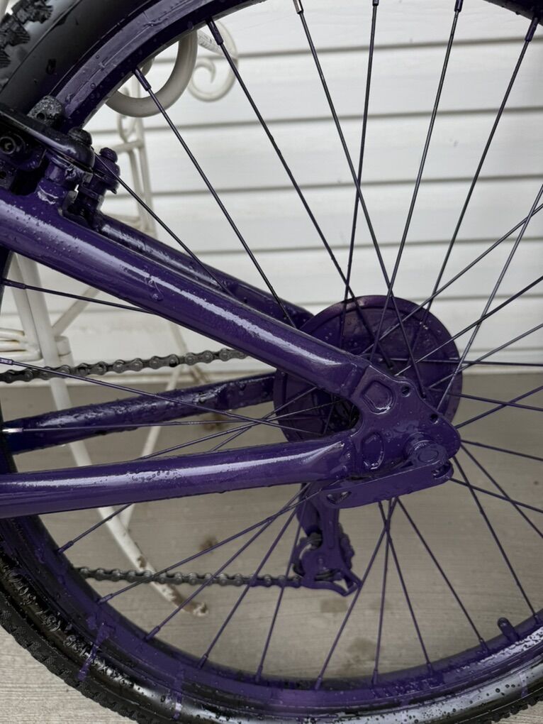 Good condition Spray painted black and purple Bike shown is slightly wet Tire/tube size 24