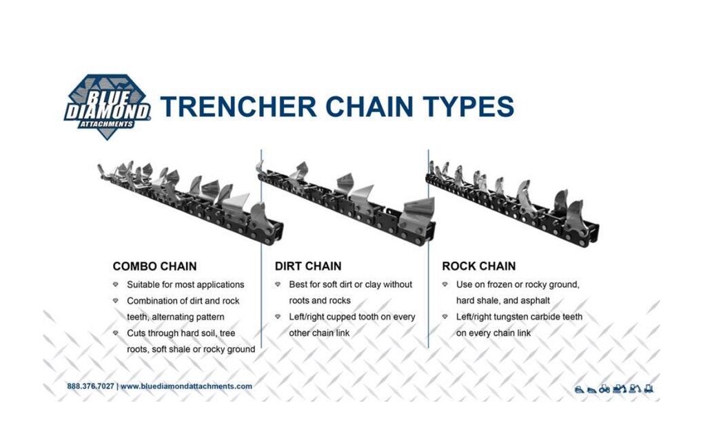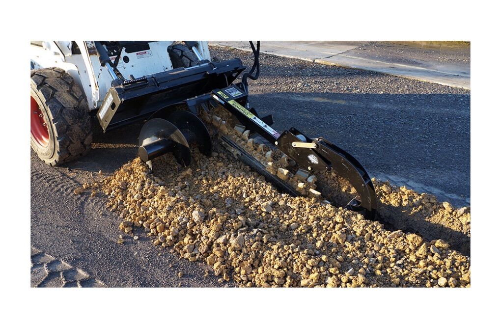 Hydraulic Flow Range: 13–25 GPM Cutting Depths: Up to 36″ Cutting Widths: 4″, 6″, and 8″ options Chain Styles: Dirt, Combo, and Rock for different soil conditions Adjustable Skid Foot: 3 preset digging depths; 24, 30, 36 Self-Adjusting Crumber: Spring-loaded design sweeps trench clean Manual Side Shift Mount: Allows precise trench positioning Spoil Auger: Moves debris away from trench for faster cleanout High-Torque Drive: Bell Eaton motor with planetary drive for maximum power