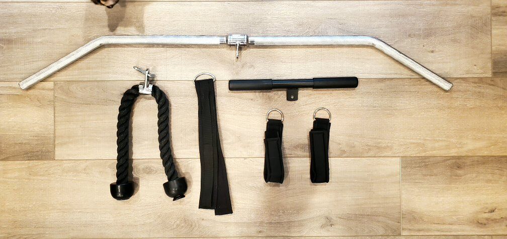 VenmoCorner Universal gym set. Like new, rarely used. Needs one cable replaced. Attachments included. $250.