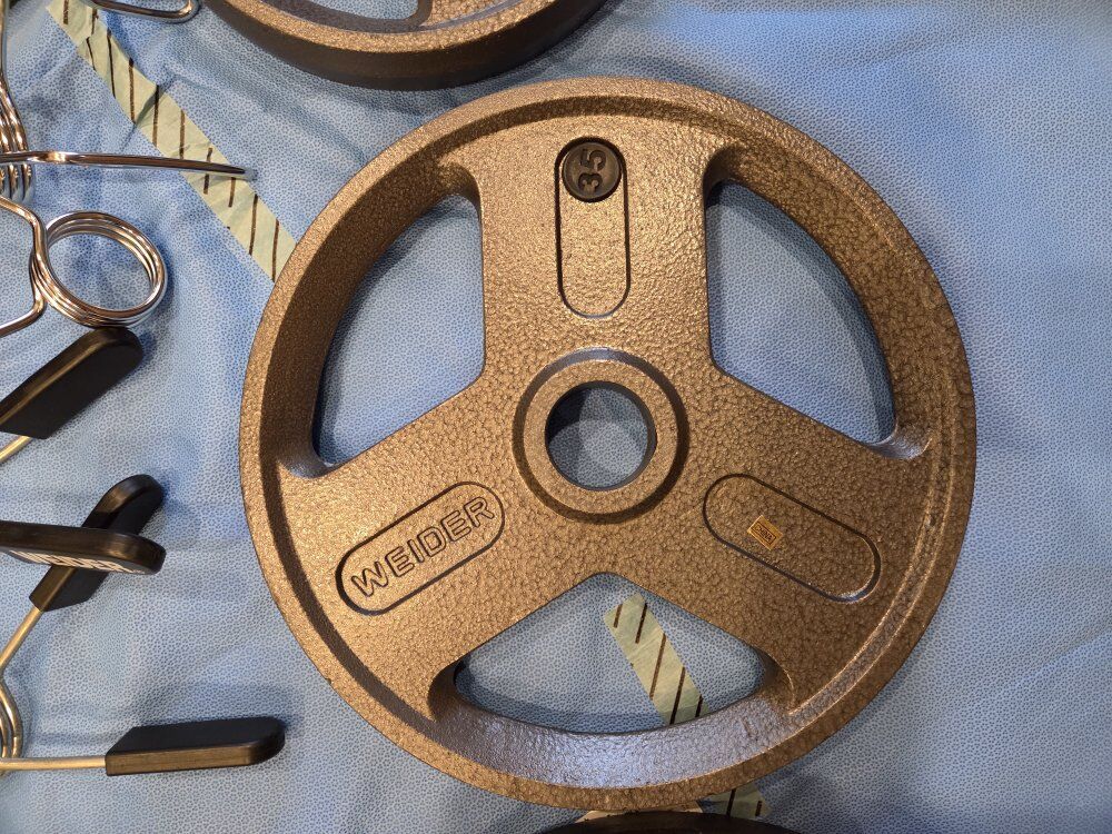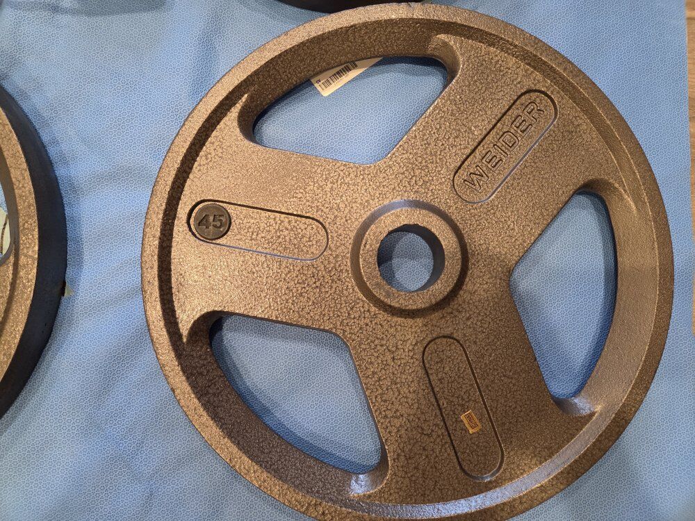 New Weider weight plates. 2-45#, 2-35#, 2-25#. $1 per pound..$210 Plate rack $100. Price is Firm.