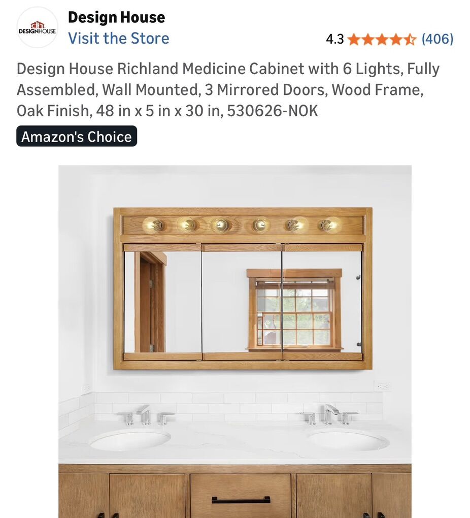 VenmoNew in box. Never installed. In perfect condition. Large medicine cabinet with 6 lights. Natural oak color. Mirrors have beveled edges. Retails for over $450 on Amazon. I’m selling mine for $250