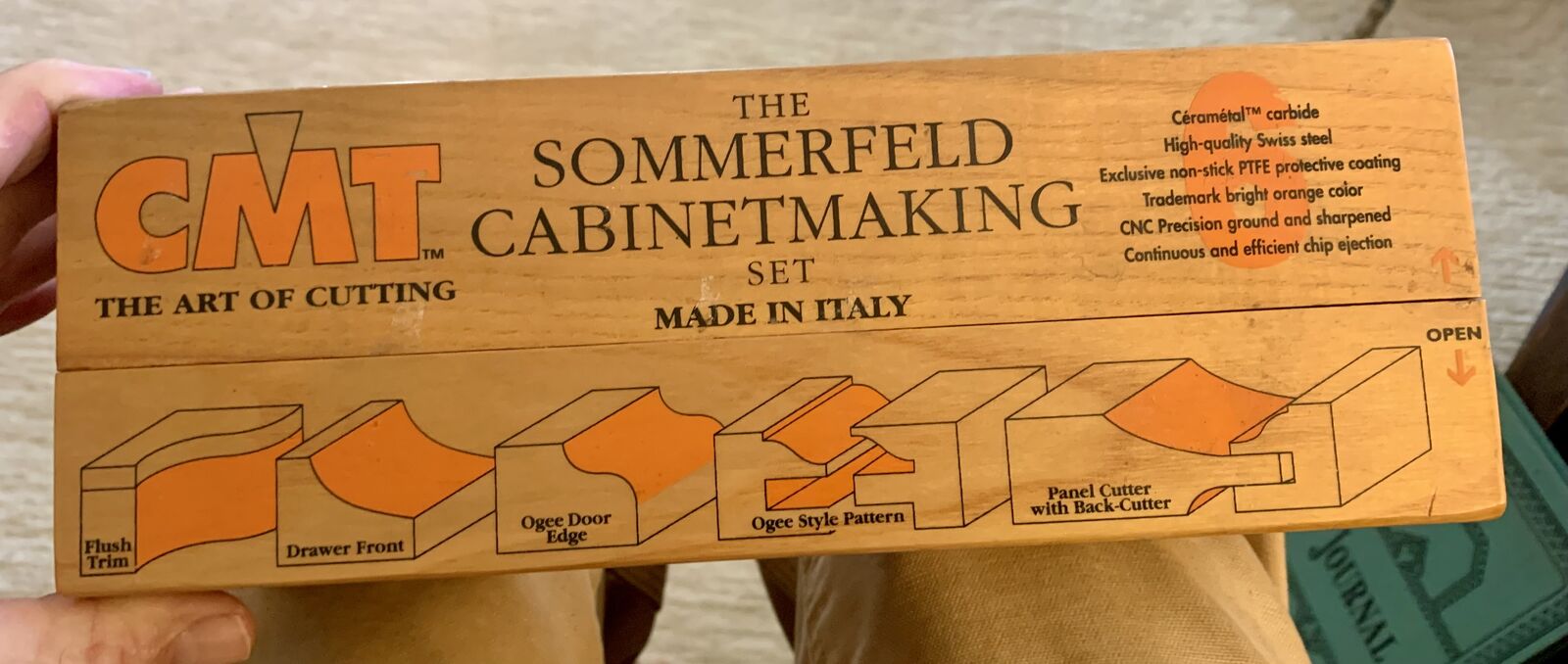 6 pc. router bit set in wooden box by respected maker CMT. Made in Italy. Show signs of a bit of use only, cutting edges undamaged and very sharp. 1/2" shank, the larger bits are to be used in a router table ideally with a variable speed router. This set is very expensive to buy new.