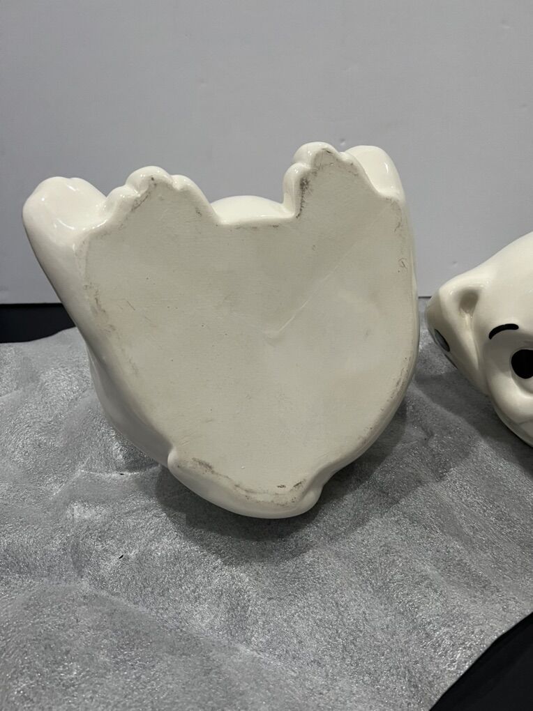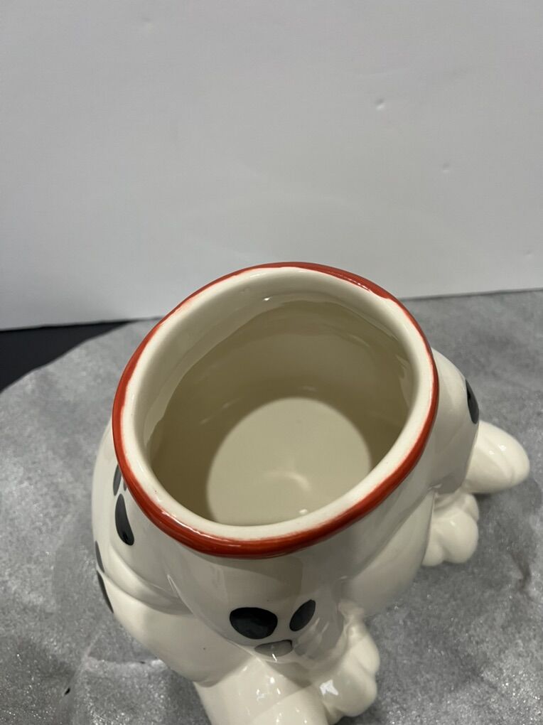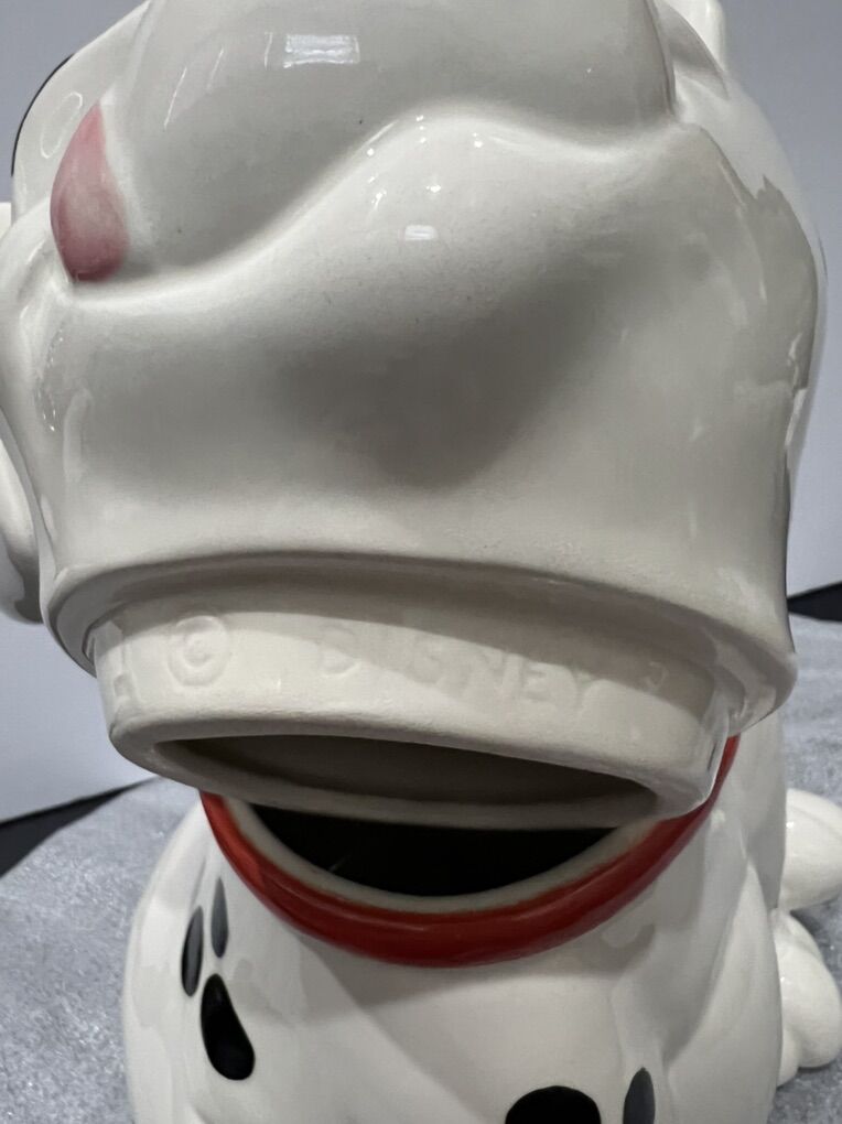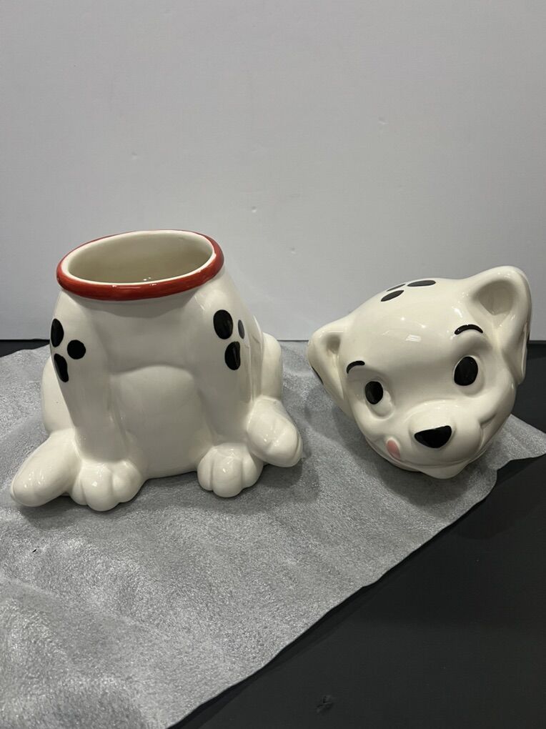 VenmoVintage ceramic Disney 101 Dalmatians puppy cookie jar, often identified as the character Rolly. The cookie jar was produced by Treasure Craft in 1993. It is approximately 13 inches in height. The head of the puppy serves as the lid. It features a glossy white finish with black spots and a red collar.