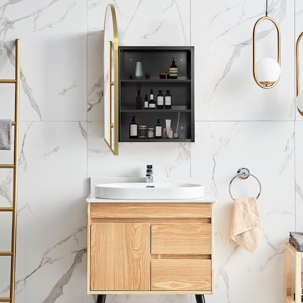 24 in. W x 36 in. H Arched Gold Recessed/Surface Mount Medicine Cabinet with Mirror