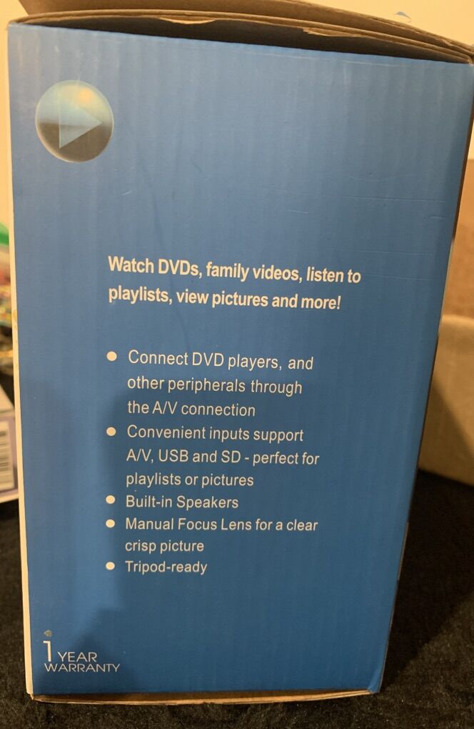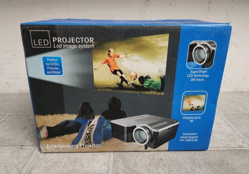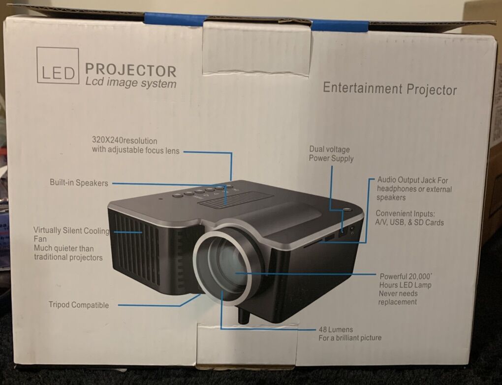 Entertainment projector information The LED lamp can work for over 20,000 hours and can provide beautiful colors Manual focus adjusting get picture for 20 to 60 inches Professional troubleshooting and protection measures Projector is small and light easy to carry with you Easy changing in 16 :9 and 4:3 aspect ratio Low power consumption, echo oriented Multiple function interface : AV, VGA, SD, USB, HDMI Vehicle power supply supported easy to use