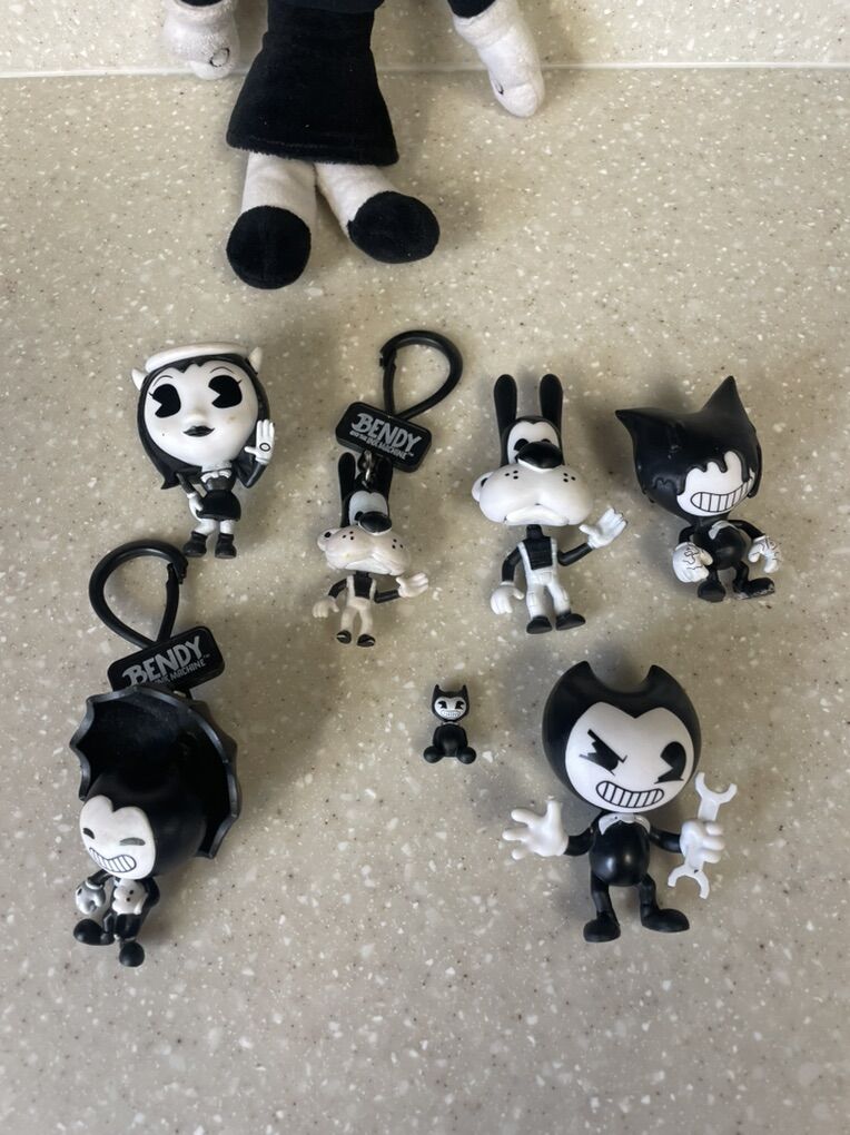 VenmoThis is a collection of merchandise from the indie horror game Bendy and the Ink Machine. The large item is an Alice Angel plush, typically around 10 inches tall. The smaller items appear to be various mini-figures and keychains of characters such as Bendy and Alice Angel