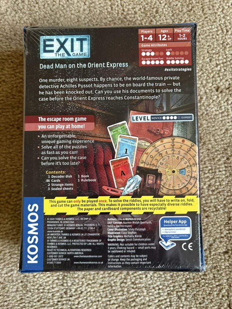 NEW (sealed in plastic) EXIT: The Game--Dead Man on the Orient Express. Can you solve the case before the train reaches its destination? An escape game. By Kosmos, Inka & Markus Brand, 2020. 1-4 players, age 12+. New, unopened condition. Text only. Cash or Venmo.