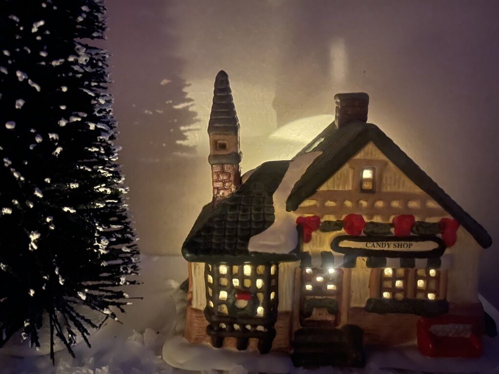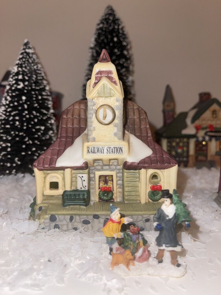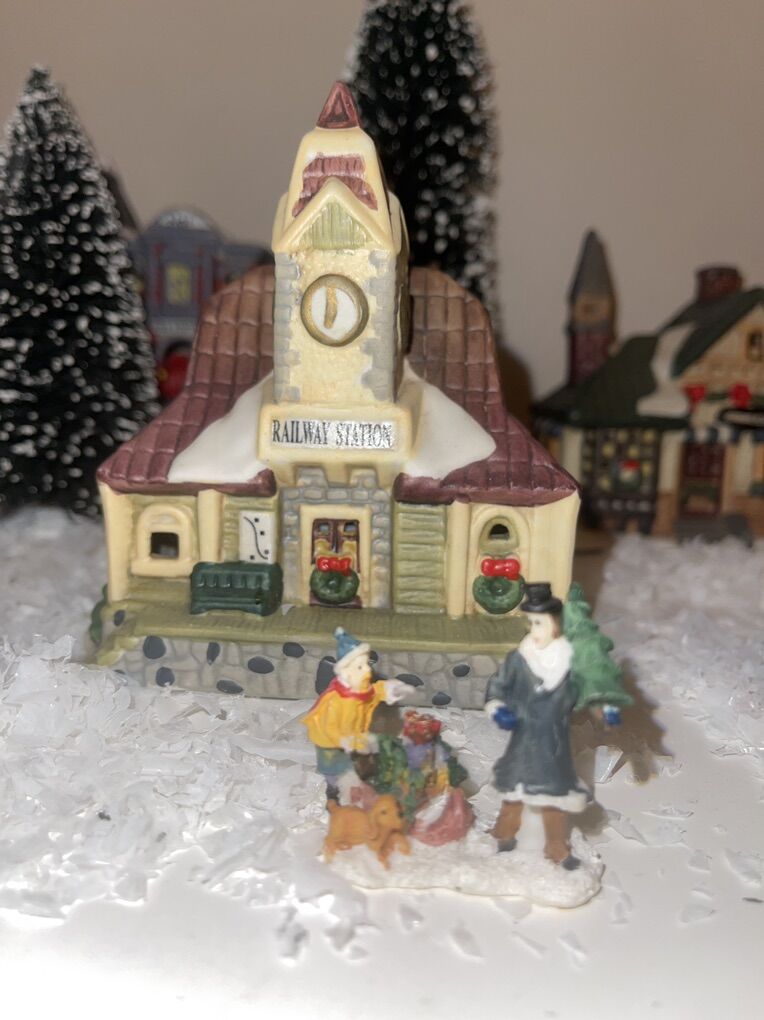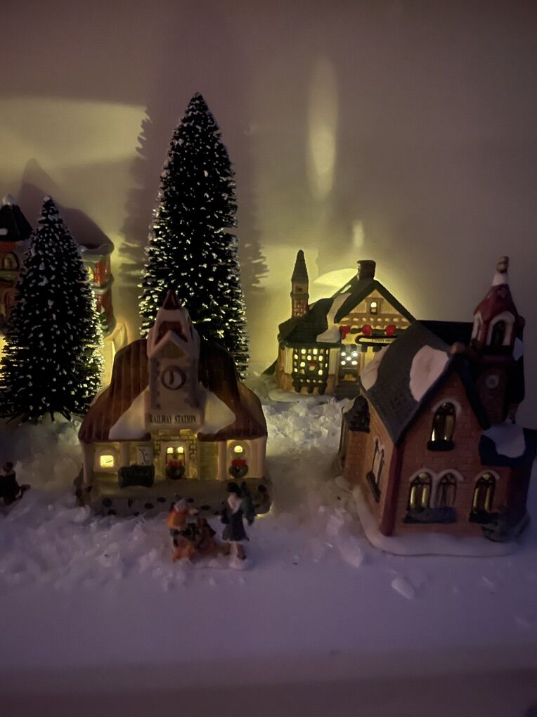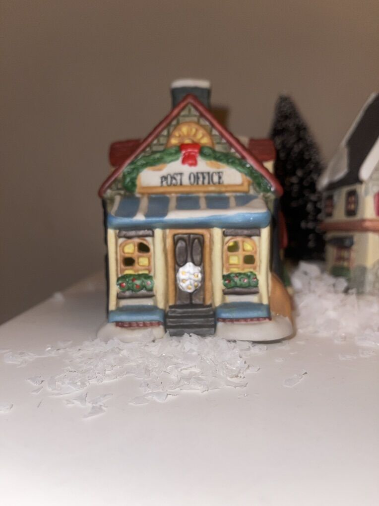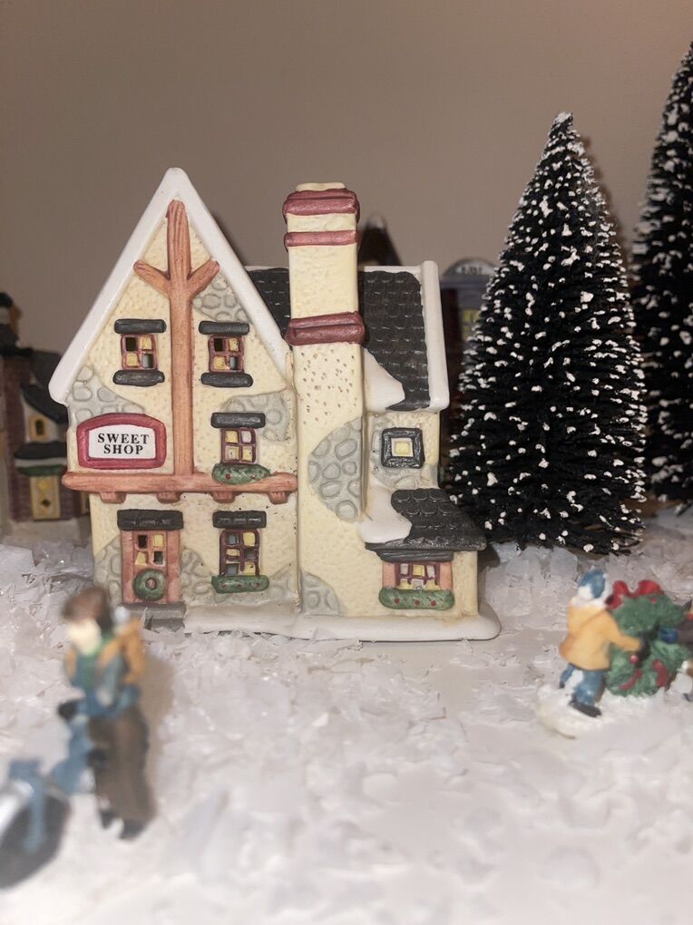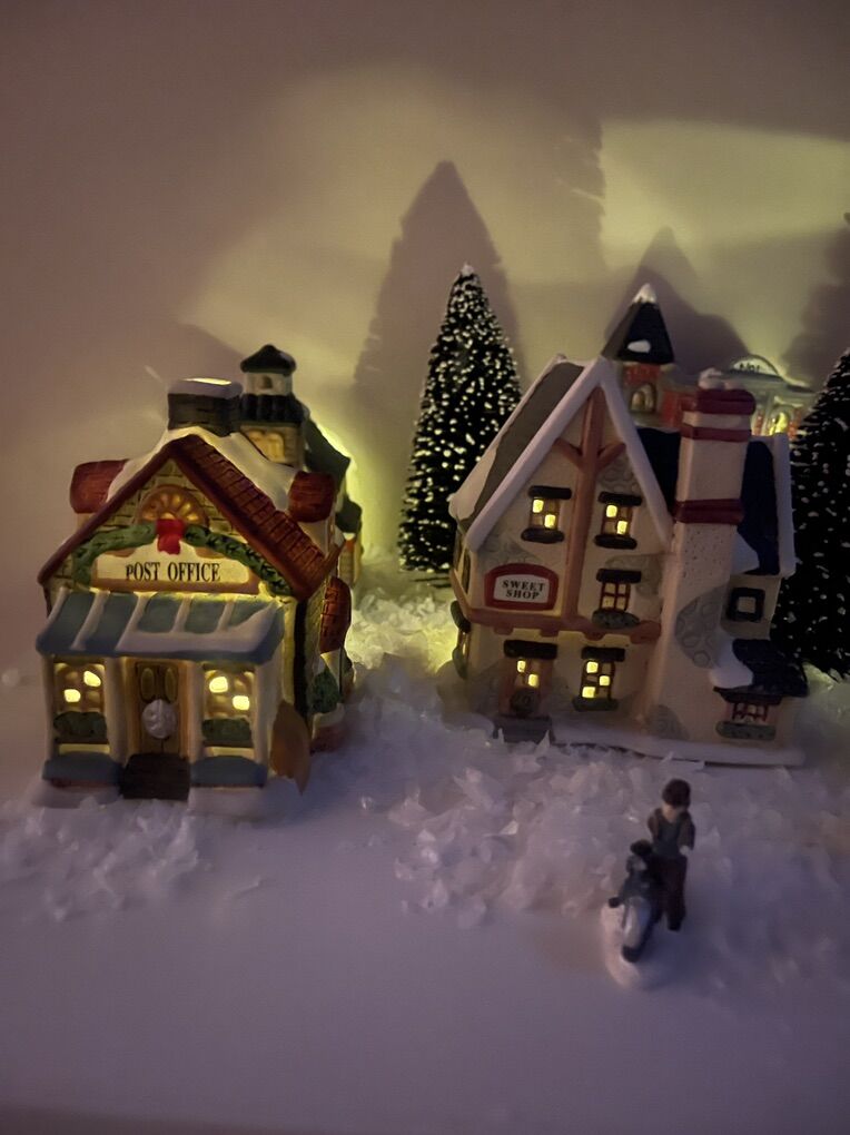 PayPalThis is a fun little village that’s perfect for an end table or other small space. It comes with seven buildings, and includes four “people” sets and three Department 56 trees. Also comes with the “snow” if you want it. The houses are approx 5” tall.